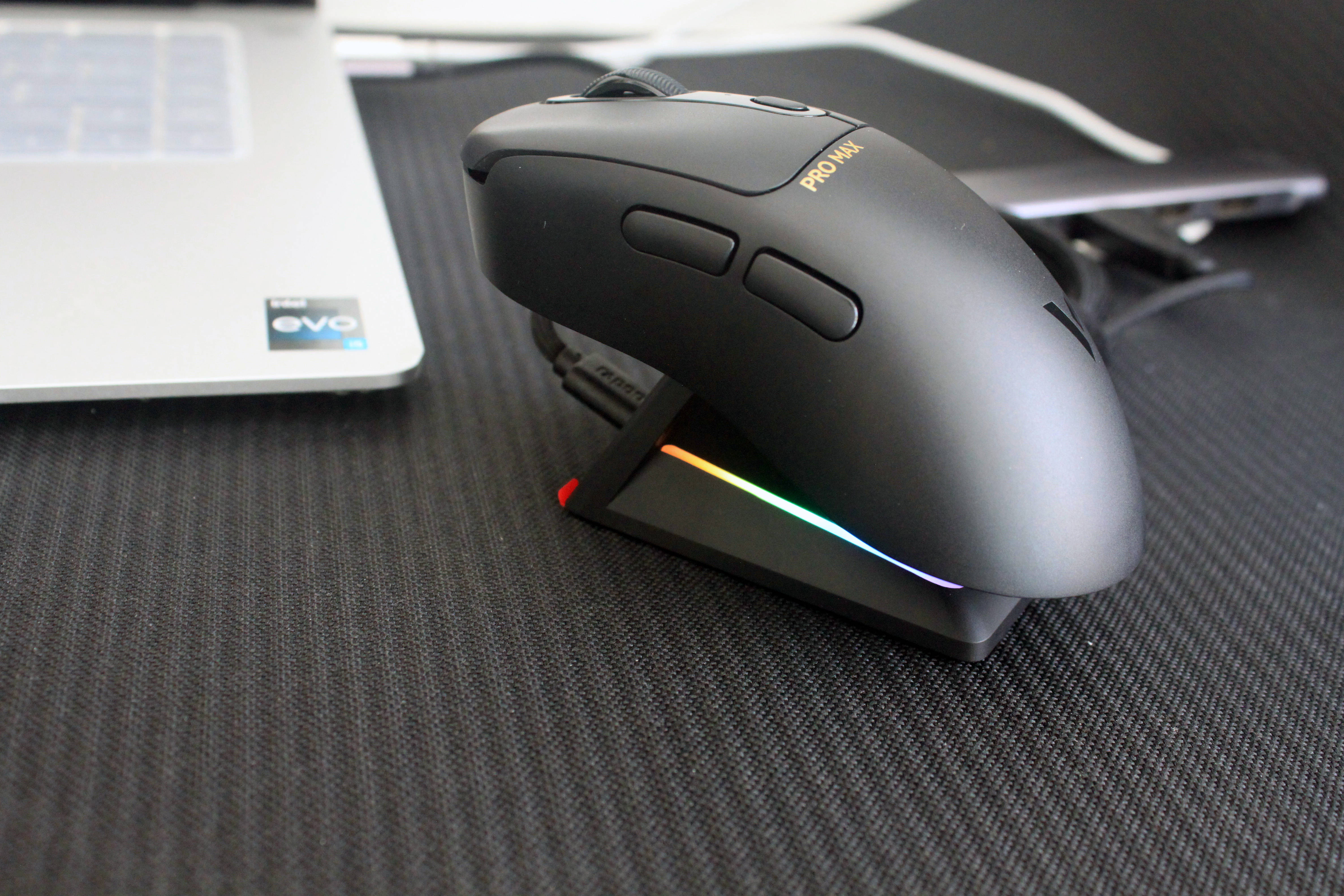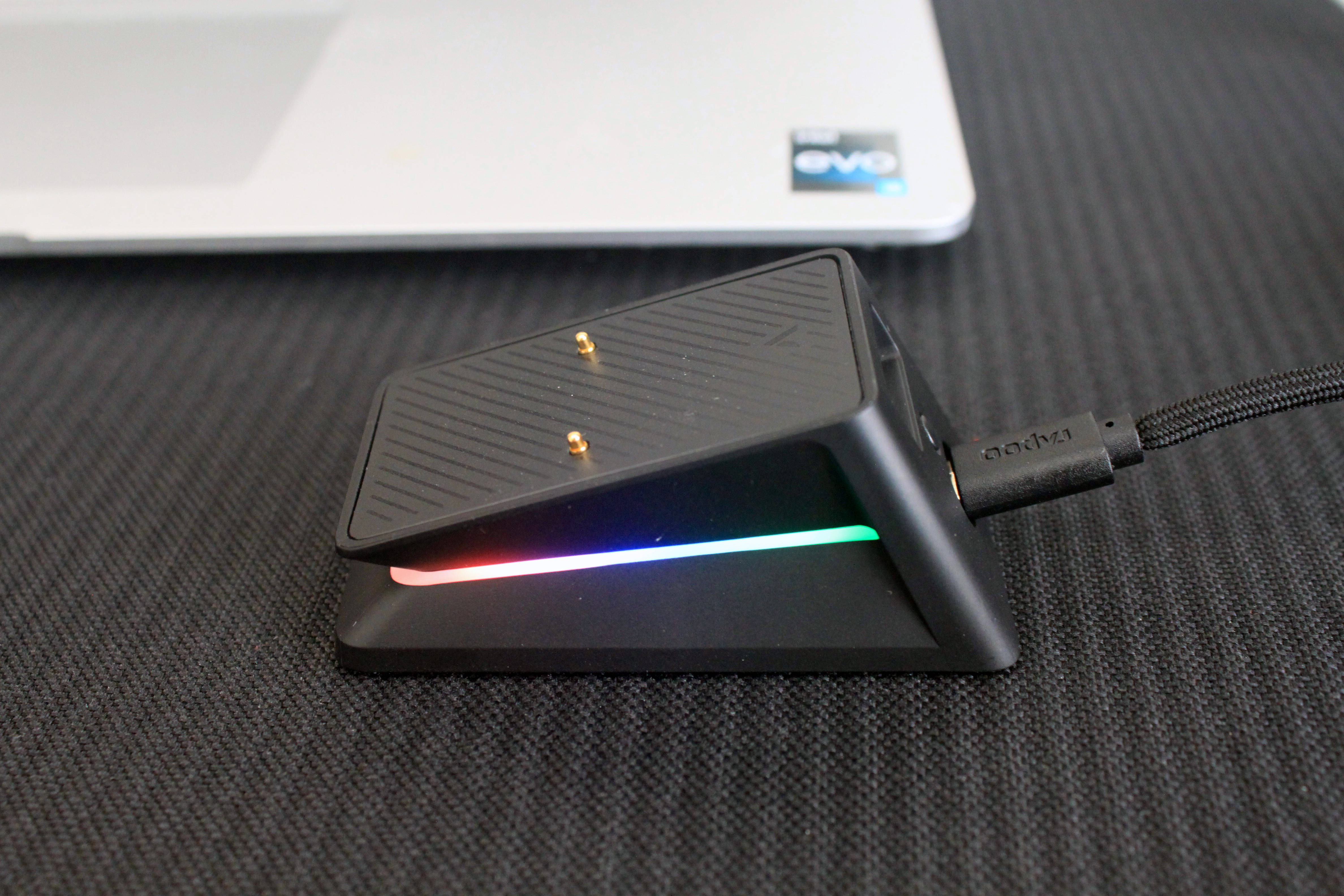 雷柏P5无线充电底座还搭配了RGB背光系统,连接后炫彩的灯光也带来了很强烈的电竞感。在鼠标不使用的时候,只需把鼠标放在底座上就可以进行充电,让充电特别方便,也可以作为的鼠标的底托。