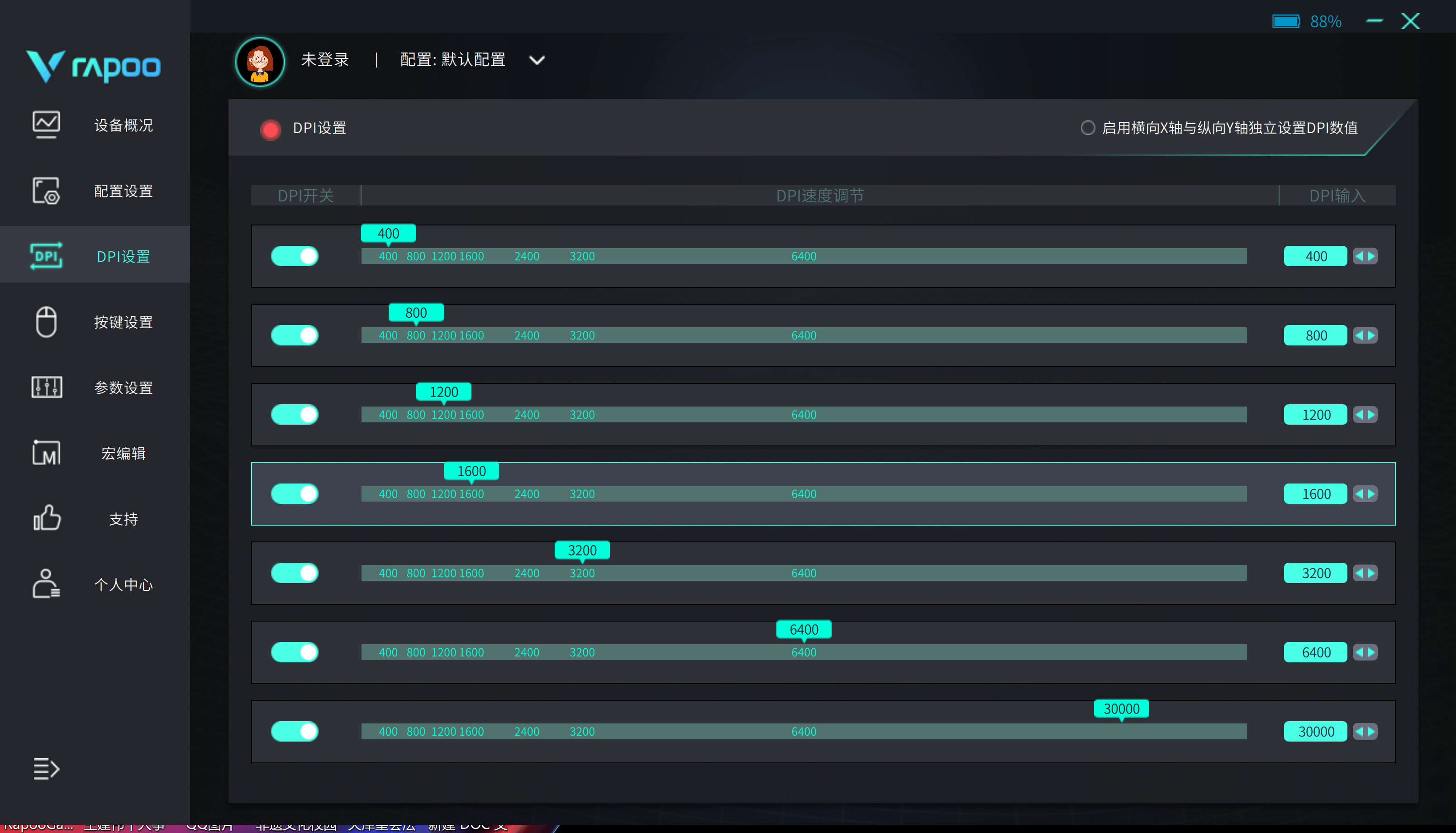 雷柏这款鼠标支持电脑应用程序的设定,鼠标支持10-30000DPI灵敏度调节,通过应用程序可以进行7档的调节,根据使用场景进行灵敏度调节,可以让鼠标使用更灵活。