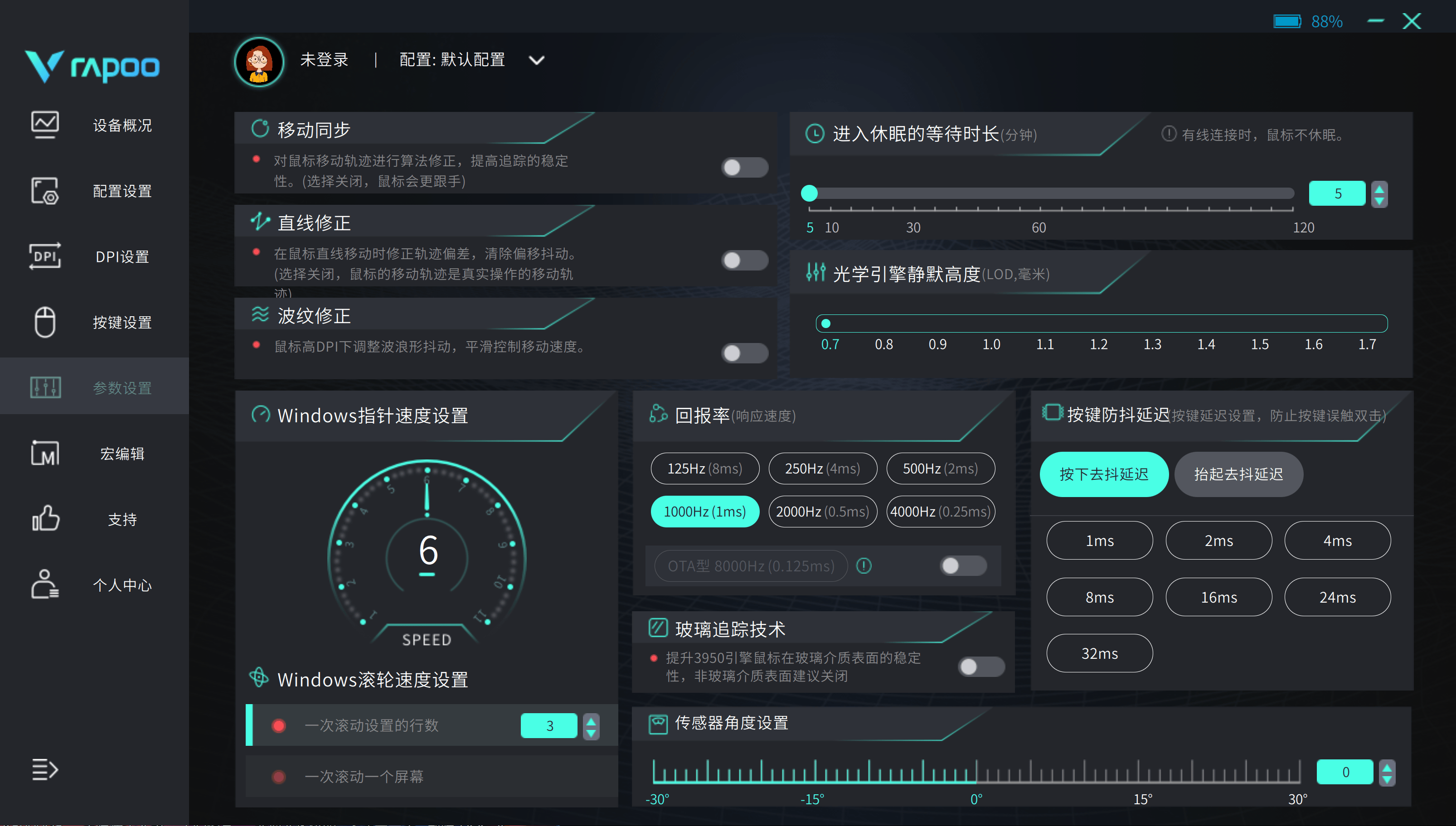 除了DPI和单键的设置外,还可以对鼠标的回报率、休眠时长和防抖参数等进行设置,让鼠标更加符合自己的使用习惯。