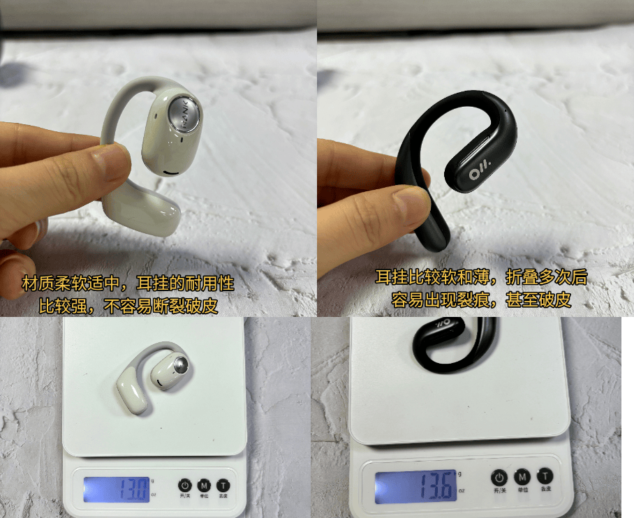 Oladance OWS Pro:单边 13.6g 适中重量,陶瓷皮肤材质触感细腻。然而,较大体积与重量分布不均,致使部分耳型不适。约 70% 志愿者反映 4 小时后耳部酸胀,尤其耳型小者,稳固性欠佳,影响舒适度。