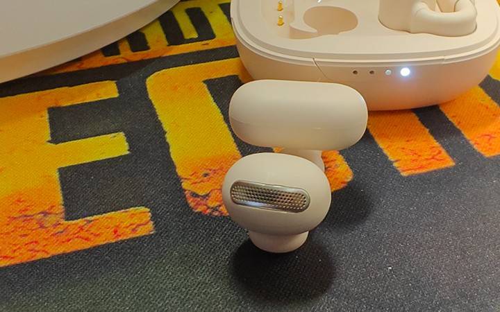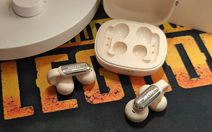 打开充电盒后,可以看到南卡CliP Pro耳机外形设计还是非常时尚精致炫酷的。充电盒前侧还拥有四颗电量指示灯,可以随时了解充电盒的电量情况,这款耳机的充电盒采用300毫安的锂电池,一次充满后,总续航时间可以打24小时。