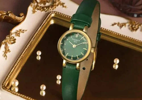 表盘设计上,天梭小可爱展现了精致和复古感。绿色表盘与金色表圈的搭配,显得既高雅又低调,而人工蓝宝石水晶玻璃的运用,提升了表面清晰度和耐磨性。它的30米防水性能使你在日常生活中无需担心意外的水滴,同时石英机芯确保时间的精准性,持久耐用,适合日常佩戴,除了是时间的记录者,更是你个性与品位的体现。