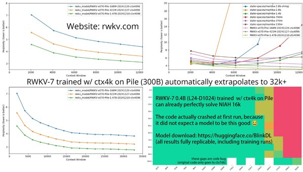 此外,RWKV-7在保持100% RNN特性的同时,拥有极强的长文本处理能力,能够轻松应对复杂的文本处理任务。例如RWKV-7-World 0.1B模型在4k上下文长度下预训练后,无需任何微调即可完美通过16k上下文长度的大海捞针测试。