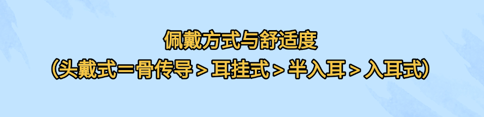 佩戴方式与舒适度(头戴式=骨传导>耳挂式>半入耳>入耳式)