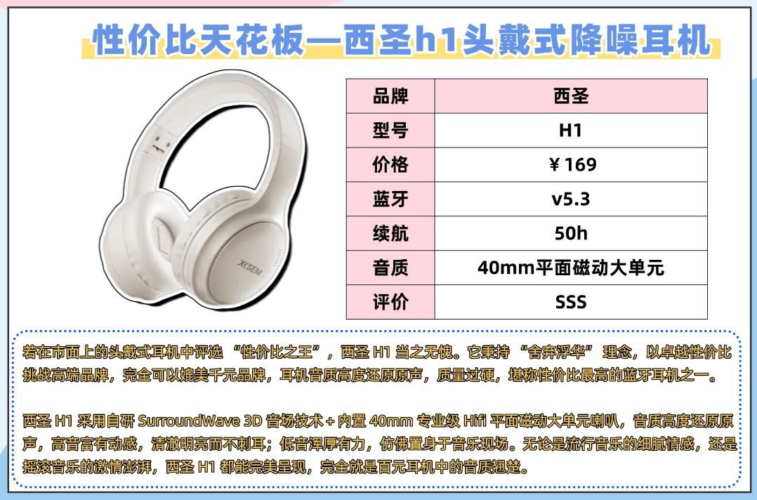 若在市面上的头戴式耳机中评选 “性价比之王”,西圣 H1 当之无愧。它秉持 “舍弃浮华” 理念,以卓越性价比挑战高端品牌,完全可以媲美千元品牌,耳机音质高度还原原声,质量过硬,堪称性价比最高的蓝牙耳机之一。