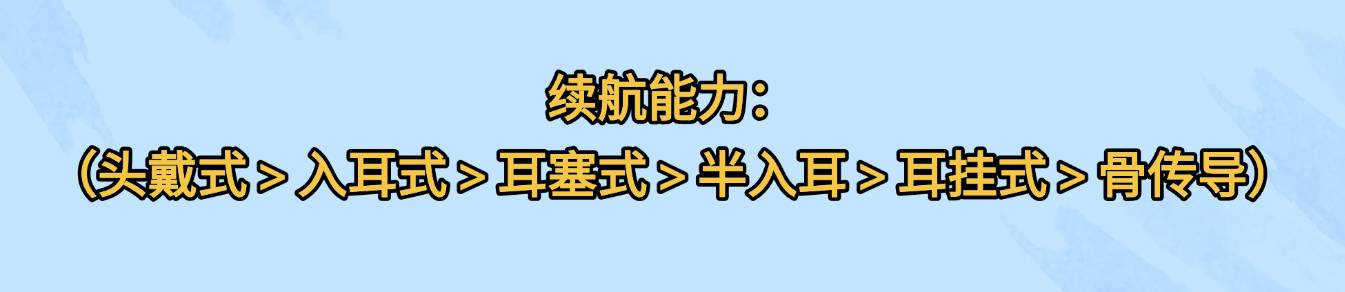 续航能力:(头戴式>入耳式>耳塞式>半入耳>耳挂式>骨传导)