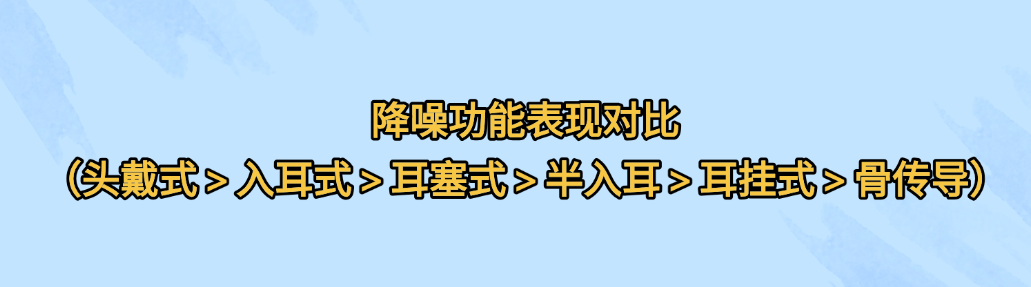 降噪功能表现对比:(头戴式>入耳式>耳塞式>半入耳>耳挂式>骨传导)