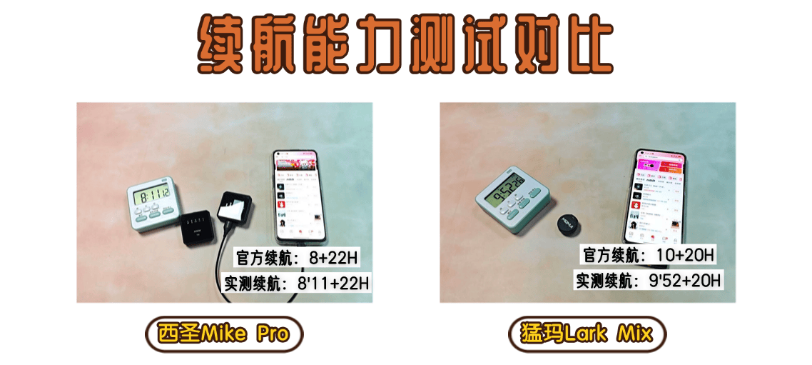 【猛玛Lark Mix】:猛玛Lark Mix这款麦克风的续航表现也是非常不错的,官方宣称单麦续航在10个小时,不过实际测试的续航时长会低一点,相差了几分钟,综合续航也能够达到30小时左右,还是很不错的,足够应对长时间的直播、录音、拍摄需求了。