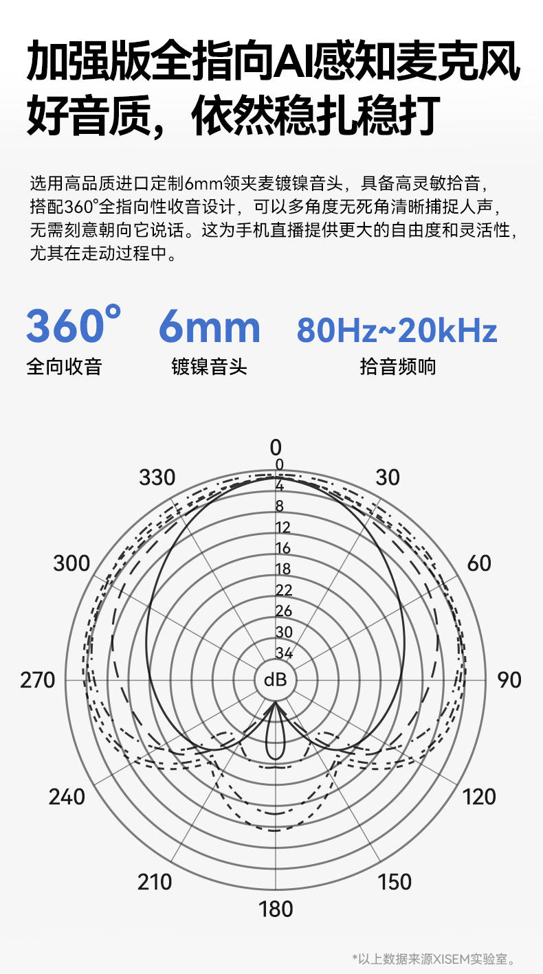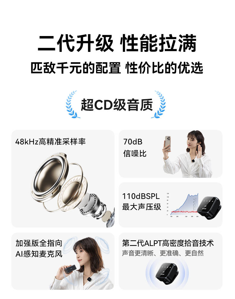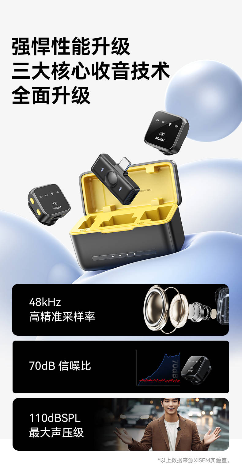 在收音核心技术上,西圣Mike 2升级第二代ALPT高密度拾音技术,将拾音范围分层分段,实现20层100段拾音,相同范围可捕捉4倍多声音细节,拾音更精准。配合加强版的全指向AI感知麦克风,以及48kHz/24Bit高采样频率,能够实现录音棚级别的收音效果,让声音细节能够清晰的重现。
