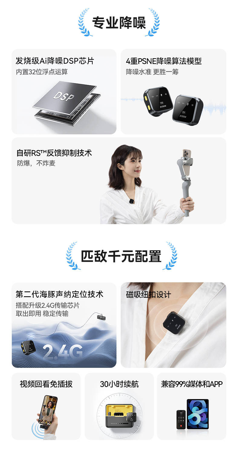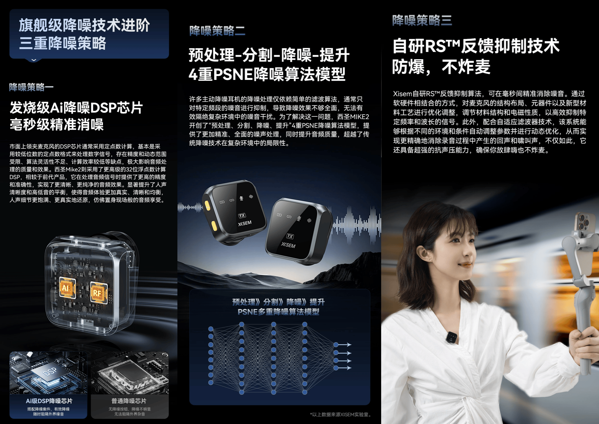 为了更好的解决噪音对麦克风收音的影响,西圣Mike 2采用了三重降噪策略。首先,西圣Mike2采用了更高标准的32位浮点数计算的DSP,相比市面上普遍存在的16位或者24位定点数计算的DSP,西圣Mike 2在处理音频信号的时候能够提供更高的精度和准确性,带来更加清晰、纯净的音频效果。显著提升了人声清晰度和高低音的平衡,使得音频体验 更加真实、清晰和均衡,人声细节更饱满、更真实地还原,仿佛置身现场般的音频享受。