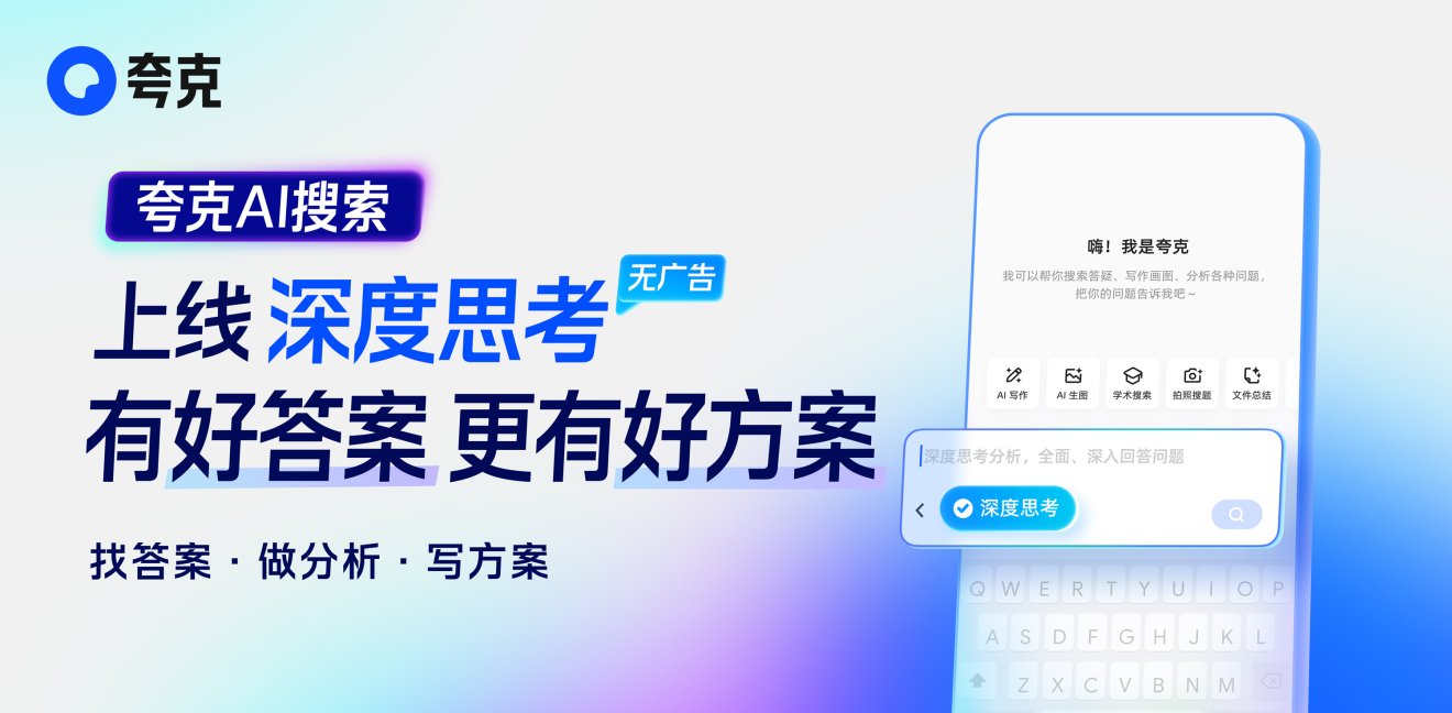 2月28日,夸克App和PC端全面升级,首页迎来AI焕新,夸克AI搜索上线"深度思考",不仅为用户提供答案,还能分析、思考、做方案。基于最新AI能力,夸克持续革新用户体验,国内搜索行业进入全新的AI搜索时代。