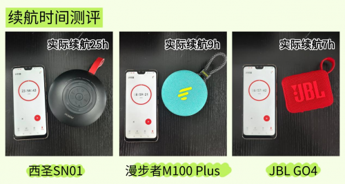 蓝牙音箱的续航时间直接影响使用的便利性。目前市面上大多数开放式蓝牙音箱的续航时间从几小时到几十小时不等。如果你需要携带外出使用的话,可以选择续航时间较长的蓝牙音箱,减少因电量不足而产生的焦虑感。此外,蓝牙音箱的续航时间还受到音量、使用环境等因素的影响。这里我们就将三款蓝牙音箱都充满电,并在中等音量的播放下,记录下它们各自的续航时间。
