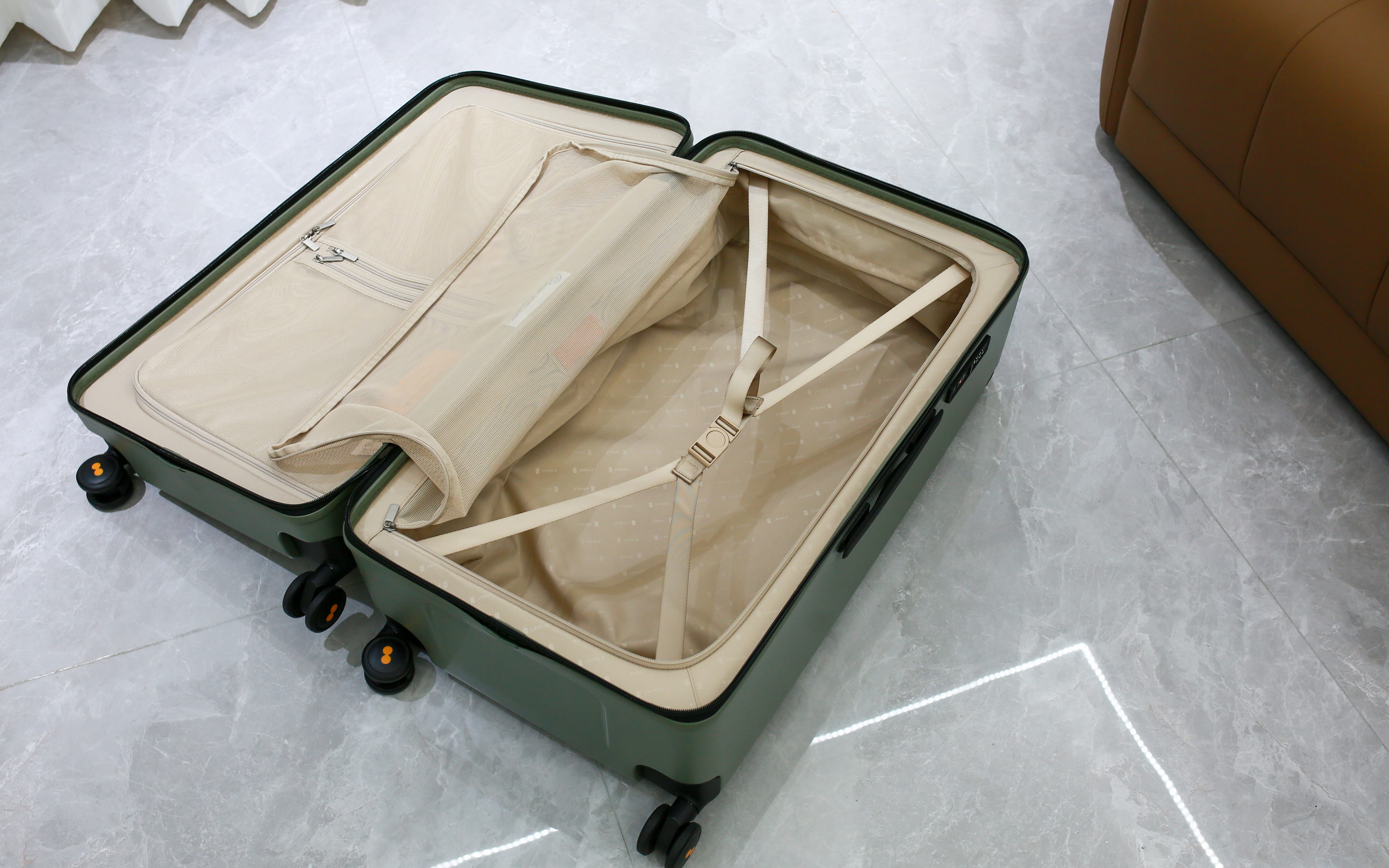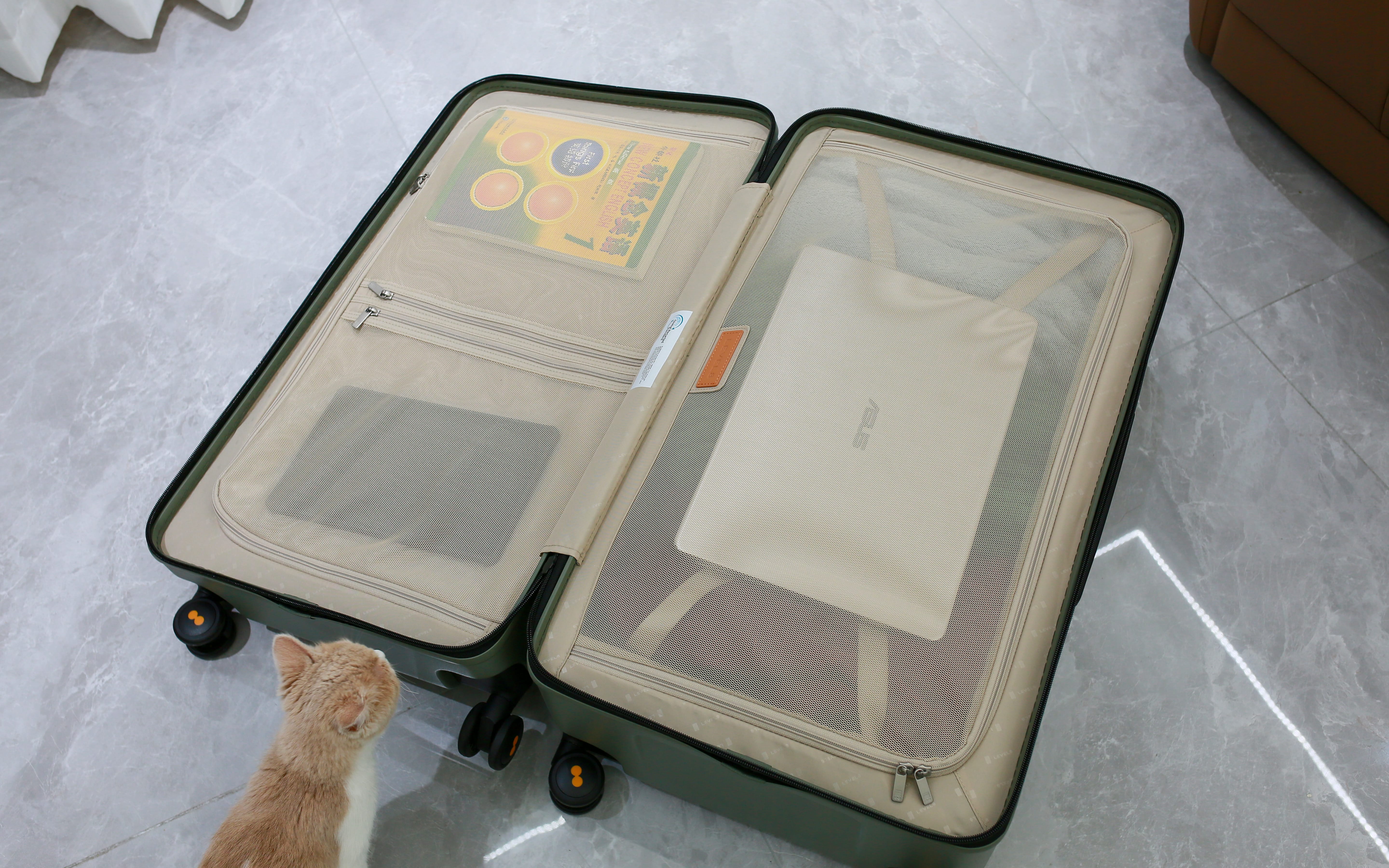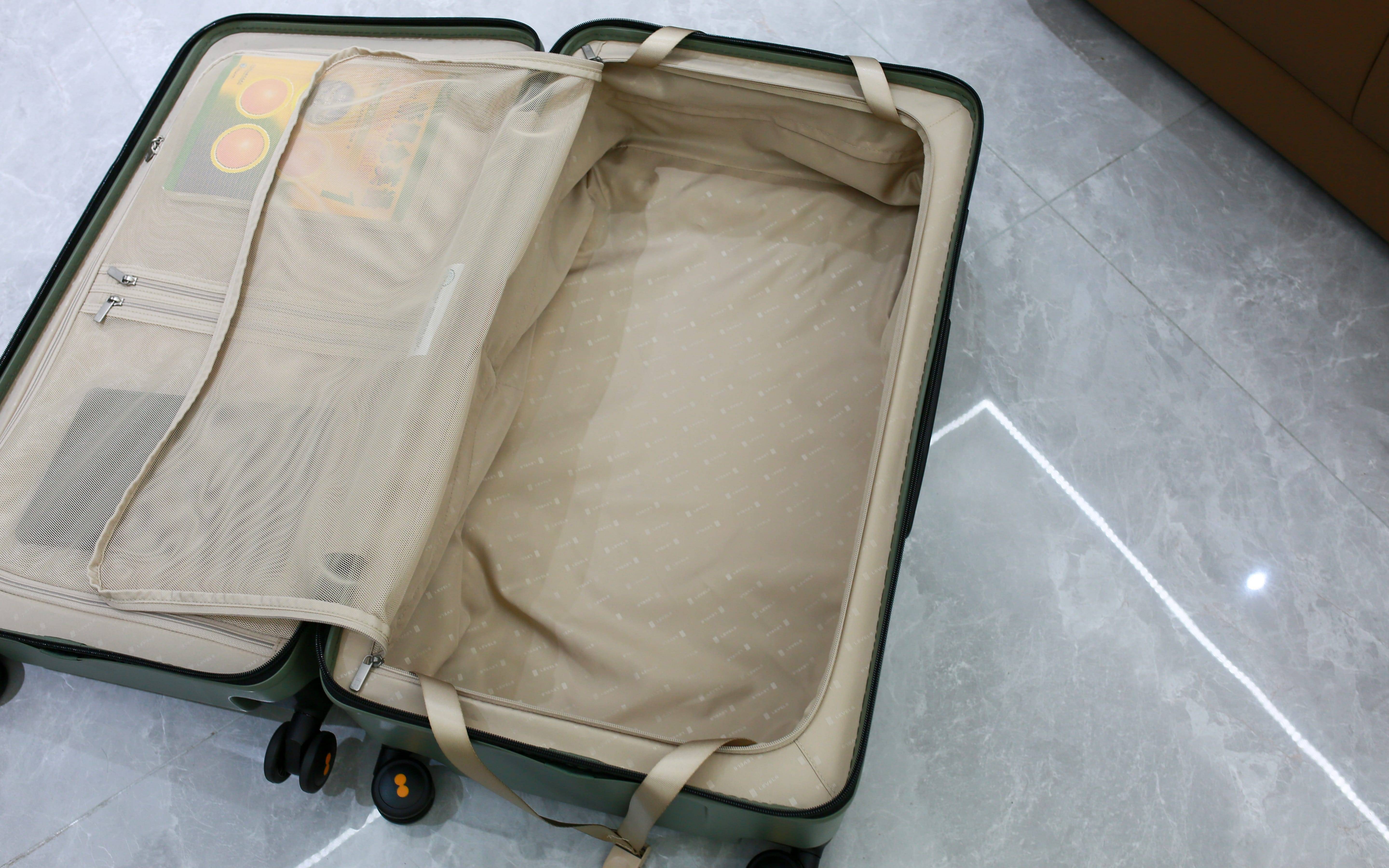 打开箱子后,拉杆那一侧是大容积,可以放主要的衣物、电脑等,另一侧可以放小物件。两侧都有隔开设置,可以避免混装。