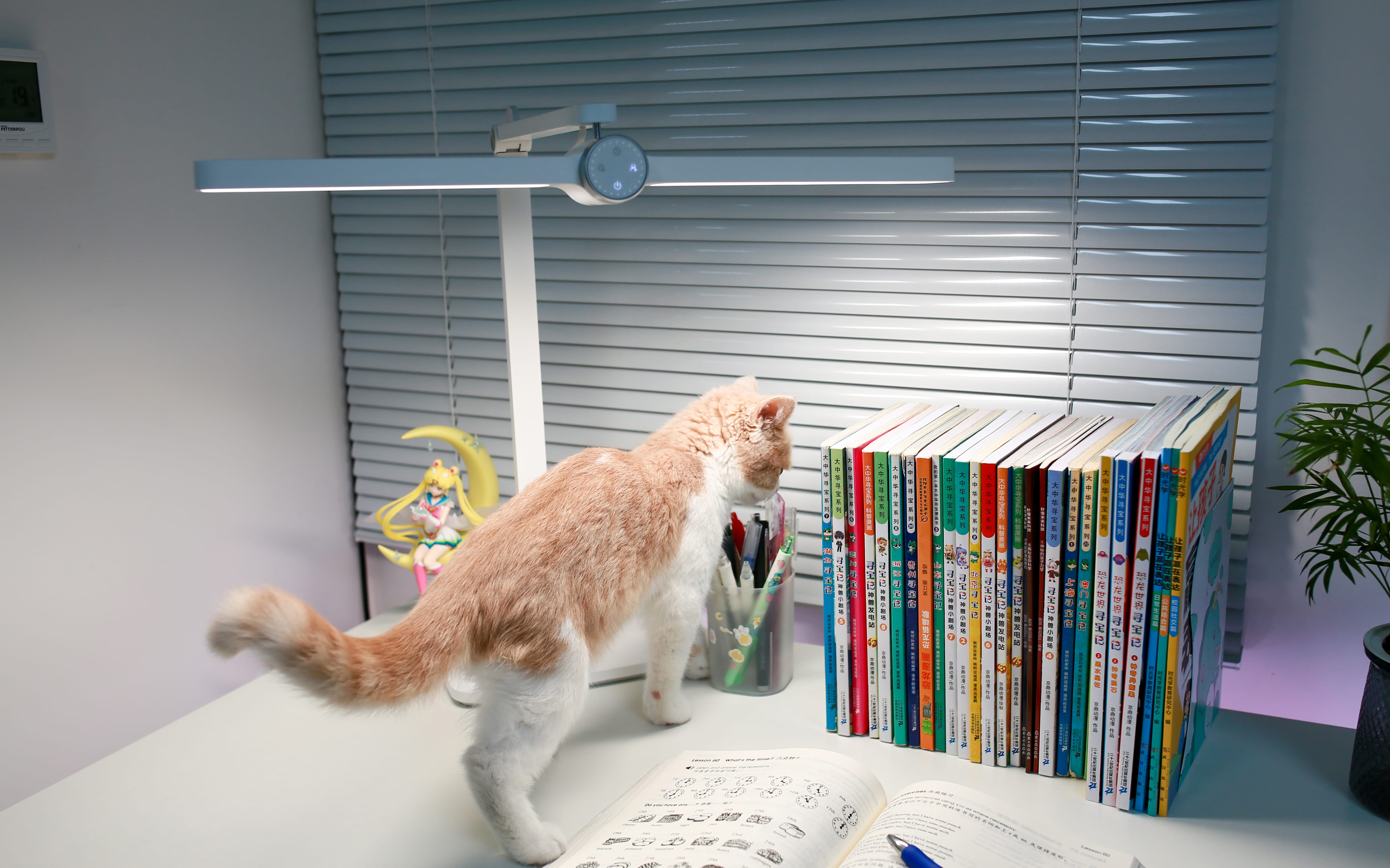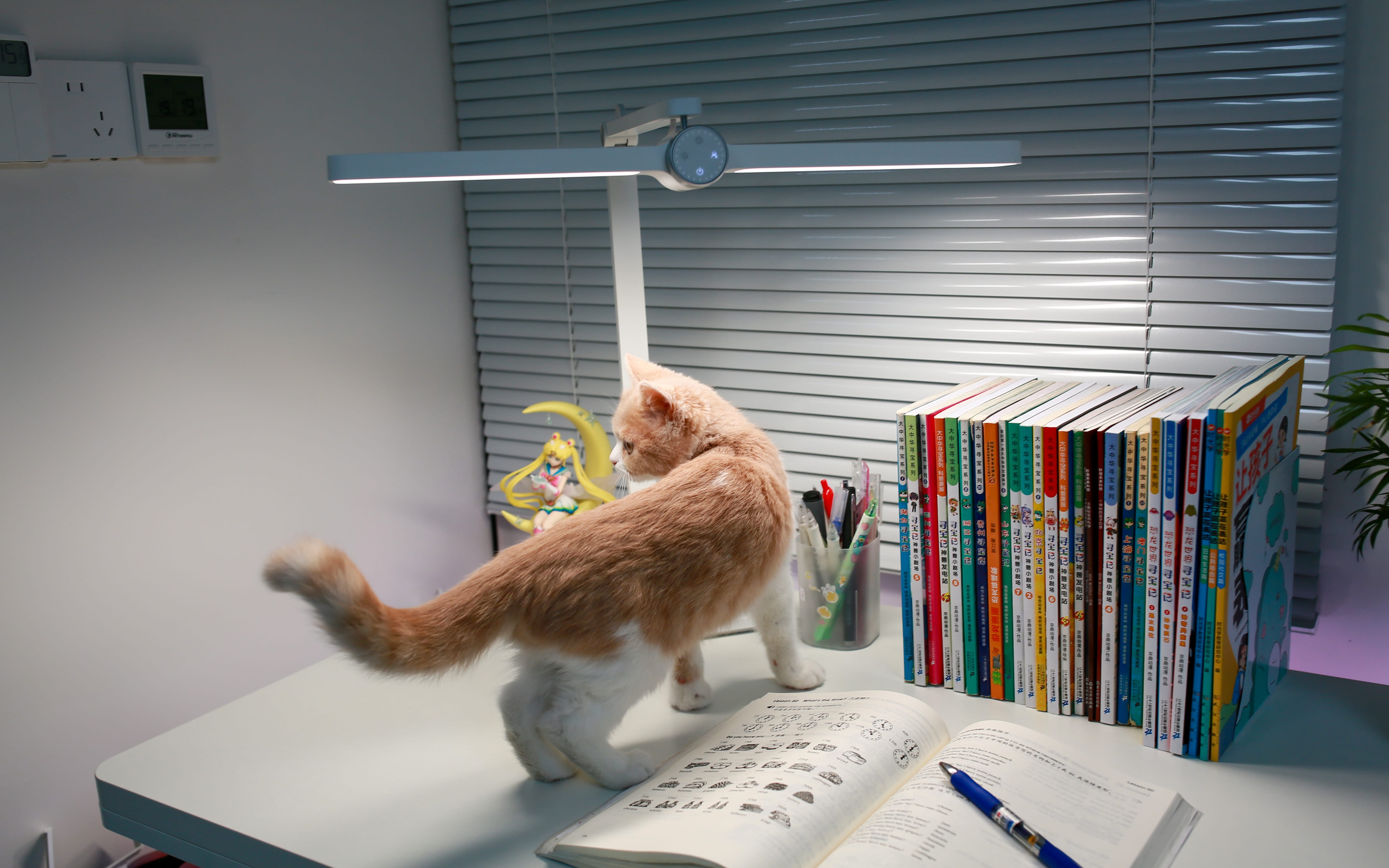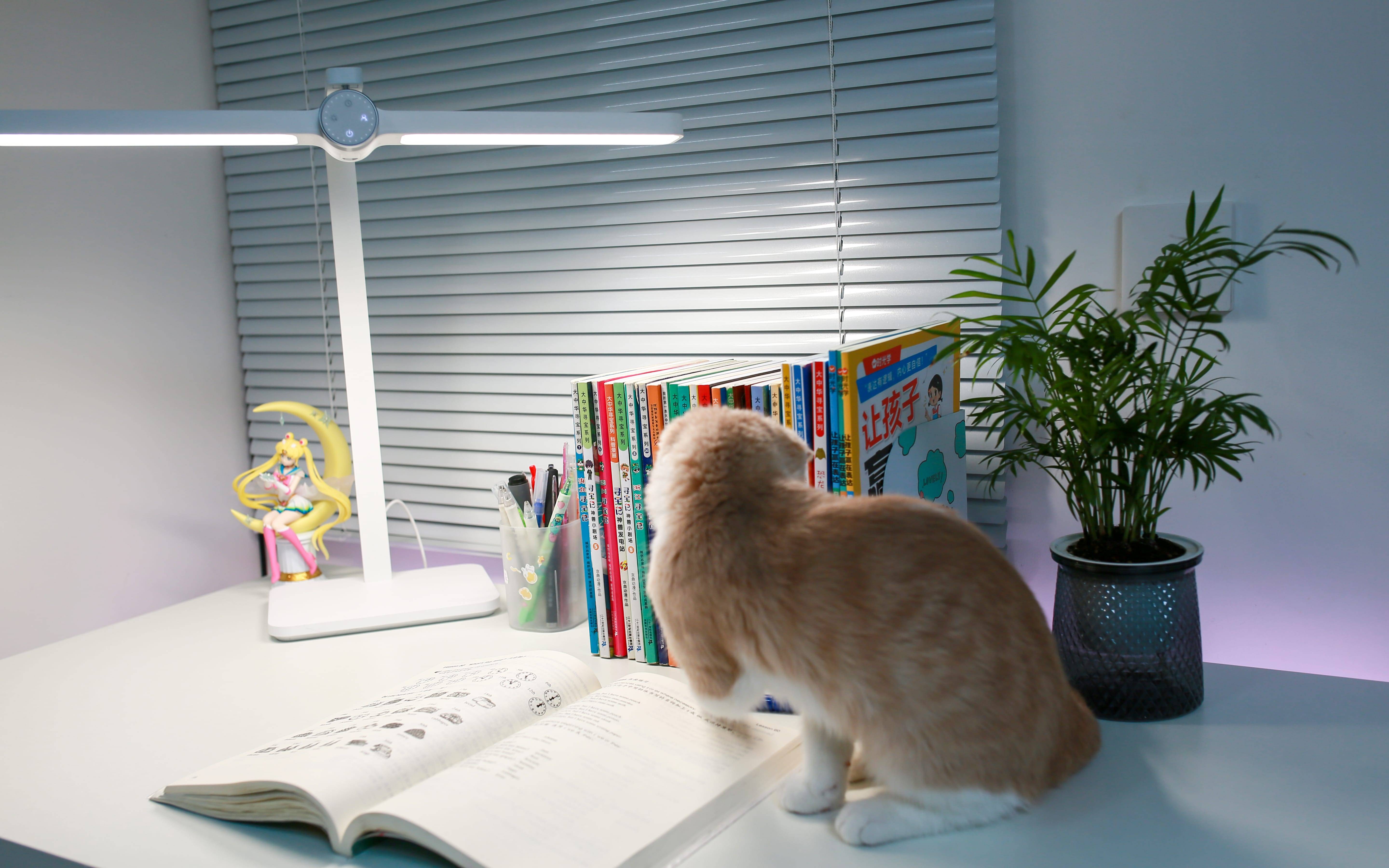 有一说一,我家爱宠果冻在灯下的样子,是的,确实有重影,任何学习灯都不可能将重影完全去掉。虽然果冻挡住了一部分光照,但是书上的图案、文字等依然看得清清楚楚~~