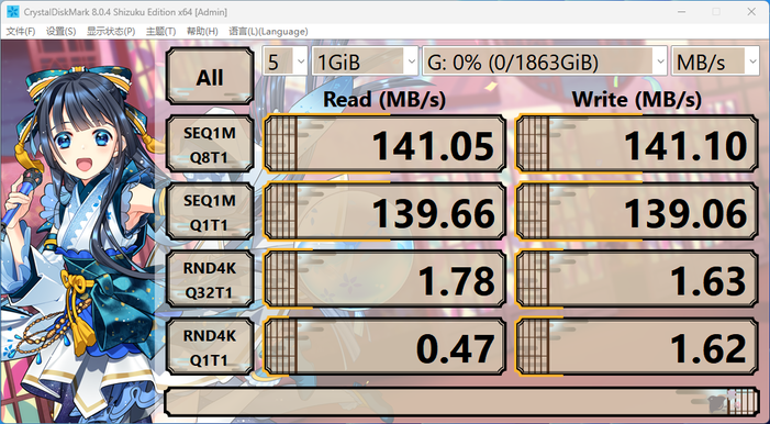 希捷锦系列2T 移动硬盘的读写大约都在138MB/s 以上,实际测试来看,顺序读取为 141.05MB/s,顺序写入为141.10MB/s,从测试结果来看,比官方标注的速度略高,读写性能标准符合3.0 硬盘该有的速度。