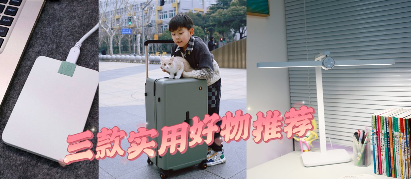 这三样好物是——地平线8号悦享家系列28英寸行李箱,希捷锦系列2TB移动硬盘以及为儿子购置的米家台灯。