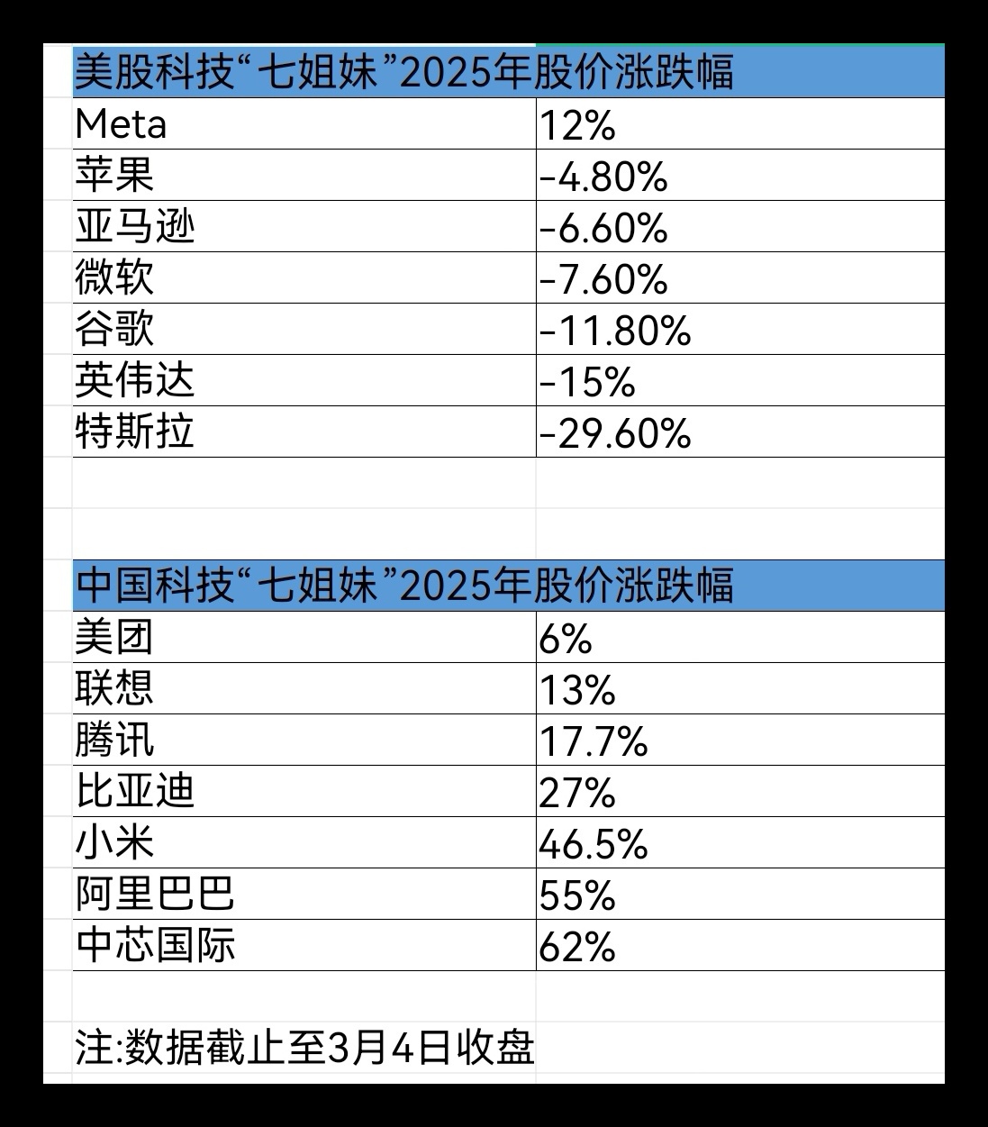 中国是一个不服输的民族,也在寻找自己的科技“七姐妹”。这不华泰证券最近,发布了一份中国科技七巨头名单,分别是比亚迪、阿里巴巴、联想、美团、中芯国际、腾讯、小米,不知道是无心还是有意。看上图中美“七姐妹”涨跌幅登记表。今年以来,中国科技“七姐妹”股价走势明显跑赢美国科技“七姐妹”。