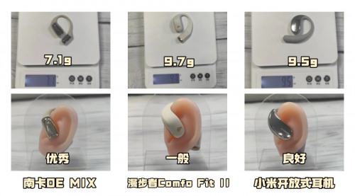 南卡OE MIX它采用了轻巧的耳挂设计,整个耳机重量只有 7.1g,戴上去几乎感觉不到它的存在,戴久了耳朵也不会觉得有负担。南卡最厉害的是它的EAA悬停舒适技术,通过10W+国人耳道数据优化,适配度高达99.9%,戴眼镜的人也能轻松兼容,完全不会觉得挤。