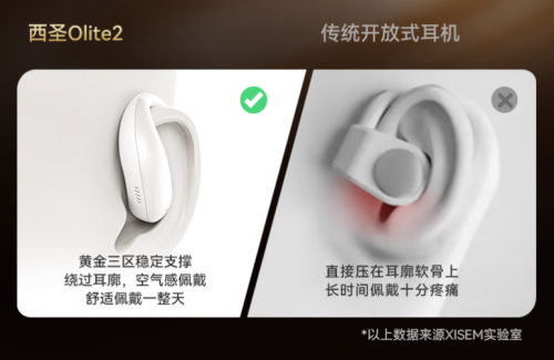 许多低价开放式耳机为节省成本,往往忽视佩戴舒适度和稳固性,认为耳机“听个响”即可,但实际上,佩戴体验至关重要。西圣在这方面堪称行业天花板,始终死磕每一个细节,力求极致舒适。单耳仅约7g的重量,进一步减轻耳部负担,同时采用全新ErgoFit2.0 分段式贴耳工学设计、黄金3区稳定支撑结构,耳廓适配度达到惊人的99.9%,运动剧烈晃动也纹丝不动,彻底解决传统开放式耳机压迫耳廓软骨的问题。不夸张地讲,与市面上所有的开放式耳机相比,西圣Olite2佩戴舒适程度更是碾压级别的超越。