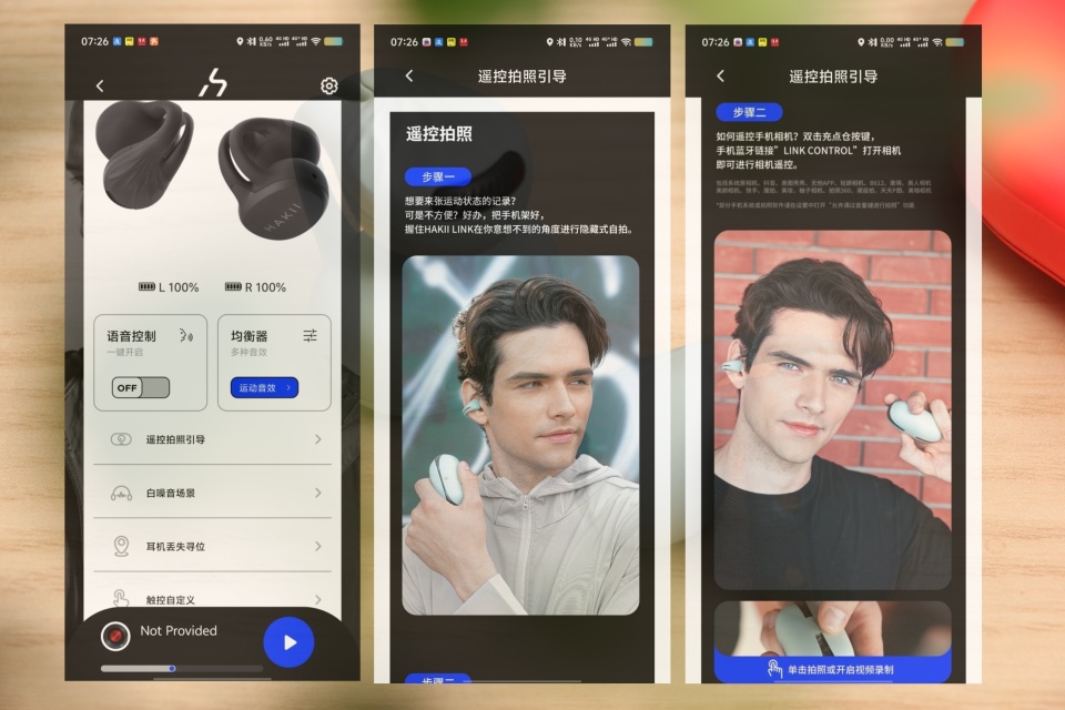 除了常用的触摸控制外,哈氪聆可更多耳机功能则需要通过其专属手机APP-HAKII来实现。装上软件添加蓝牙耳机,全程指引非常方便。这款手机APP提供了诸如遥控拍照指引,白噪声背景音乐,耳机定位以及均衡器设置等强大功能,让任何使用者都能打造隶属自己音质的个性耳机。