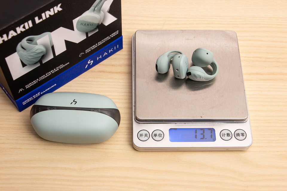 初始选择这款耳机是因为媳妇一直看不上其他一些耳夹耳机要么黑要么白的,太普通,直到看到哈氪聆可冰绿色这款耳夹式,一眼相中,再加上HAKII LINK这个品牌也是响当当的。收到货后给笔者第一感受就是比起其他的耳夹式蓝牙耳机要-大!