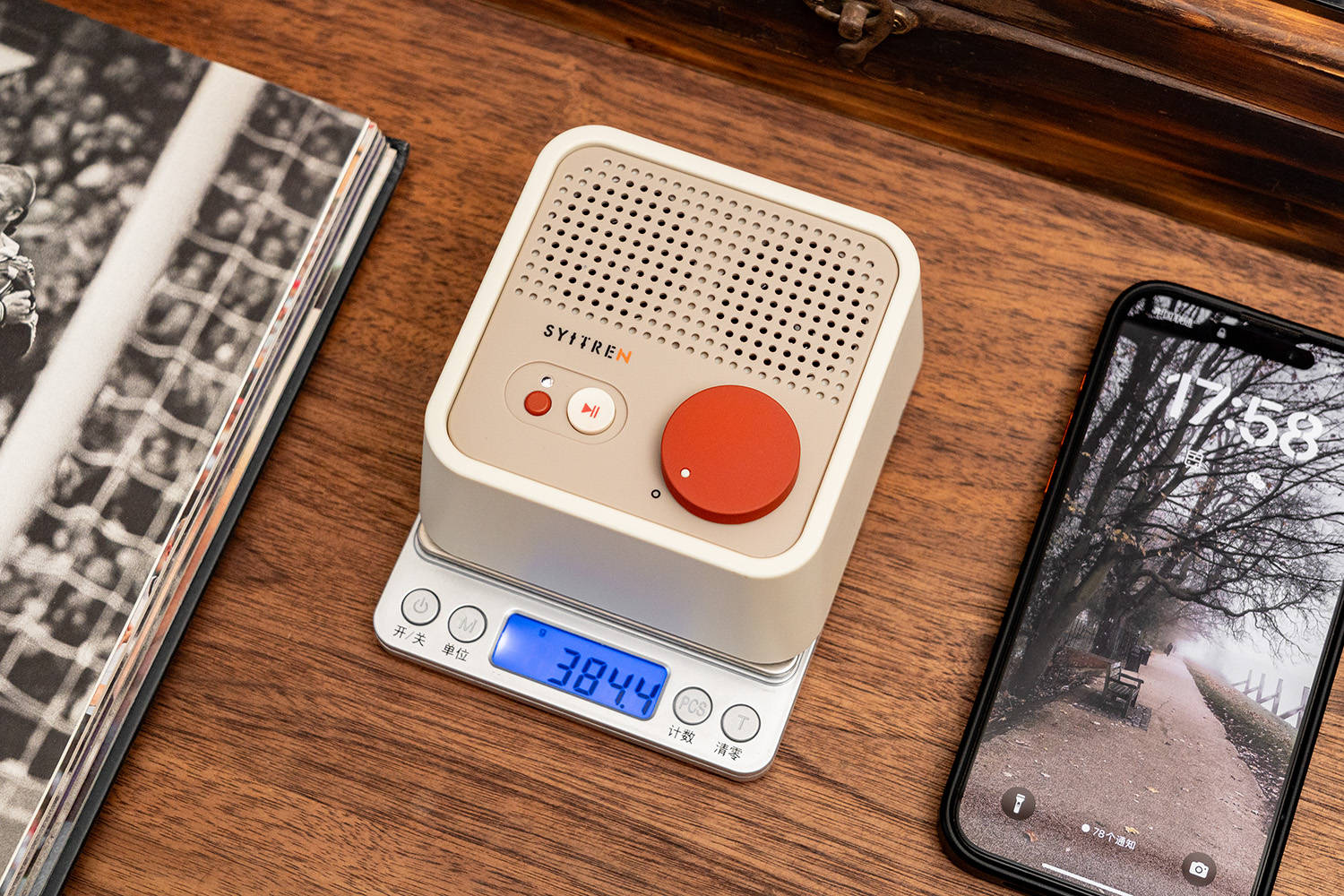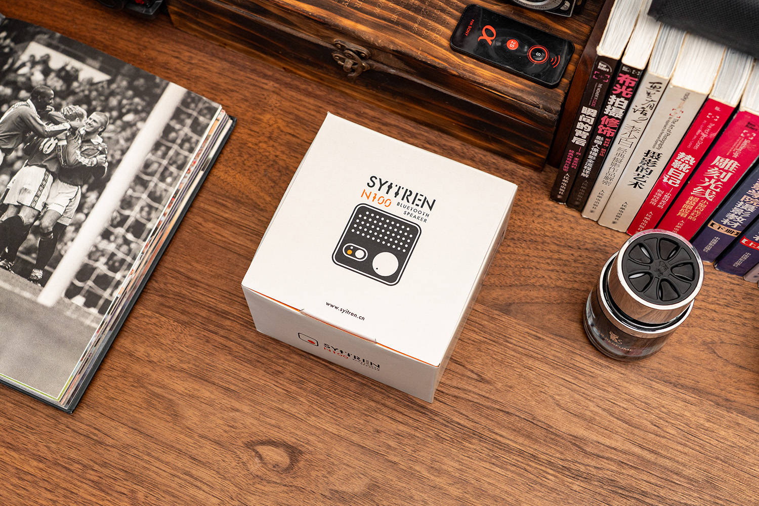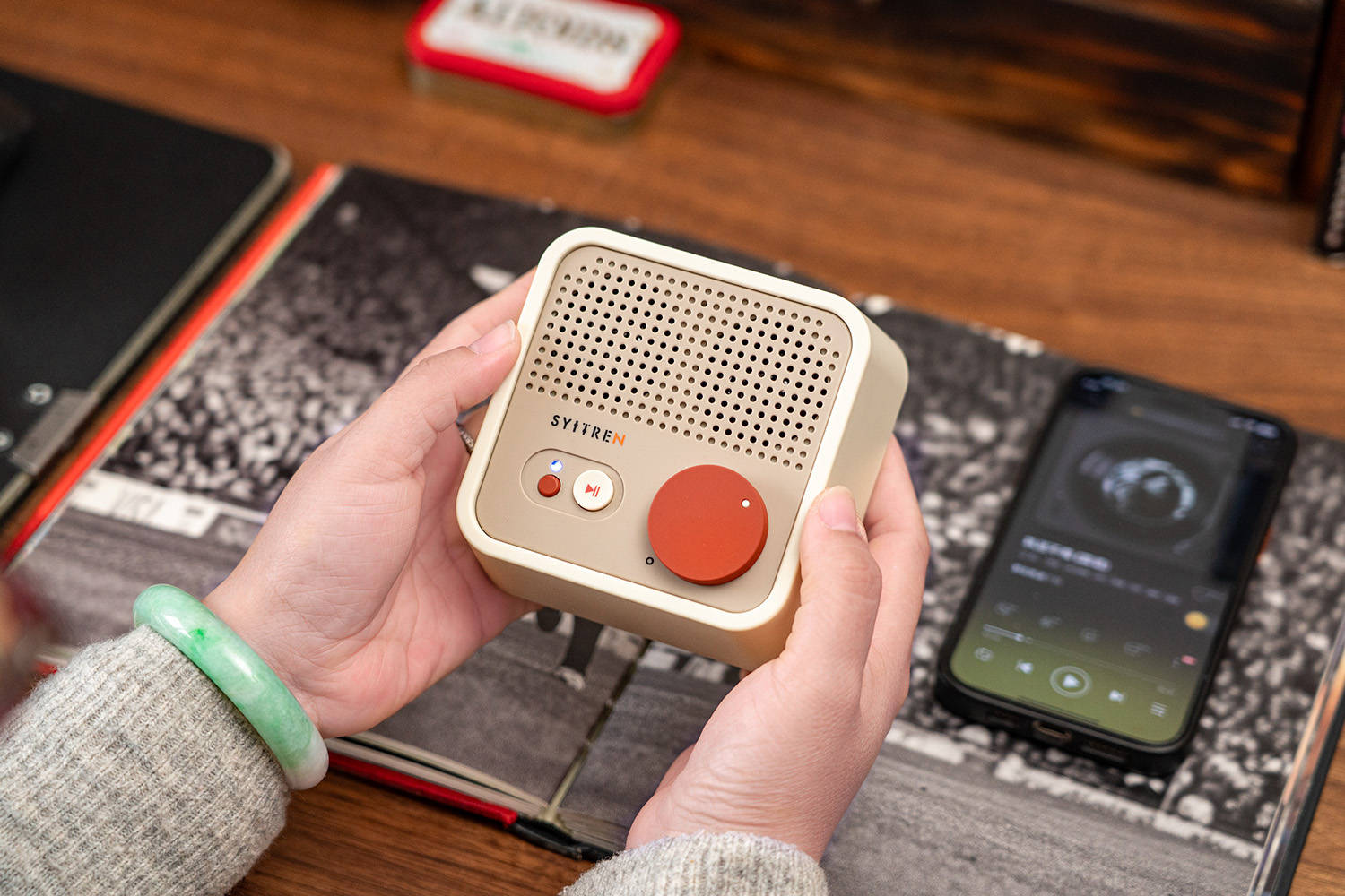 我的桌面音箱是猫王Mate4,用了有几年了,音质是没话说,不过随着乱七八糟的摆件越来越多,它的个头就成为了一个弊端,占用的空间太大了,早就想换一个小点的,但一直都没有找到合适的,直到看到赛塔林Syitren N100,瞬间就心动了,复古的风格与我桌搭十分契合,体积比猫王Mate4小了许多,但比一般的便携蓝牙音箱要大,音质和续航都应该很不错。