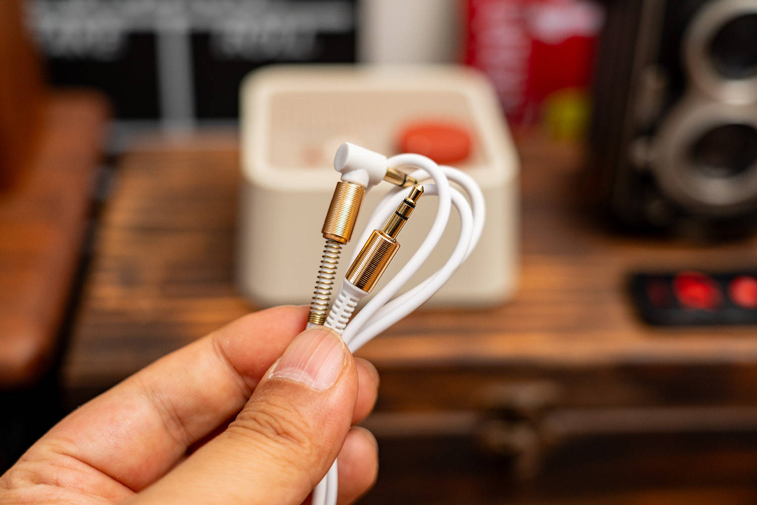 AUX音频线的质量非常好,插头部分做了抗氧化镀金处理,手柄外层套了一个铜圈,增加了耐用度,弯头是用来连接音箱的,方便靠墙贴放,加装的弹簧可以防止线材弯曲折断内芯。