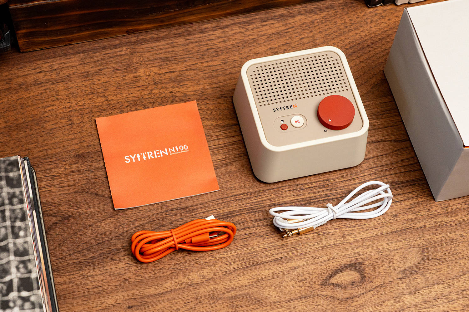 赛塔林Syitren N100有四款配色:复古白、石墨黑、芝士黄、星空银,看名字就知道我的选择必然是复古白,跟原来的猫王Mate4基本同色,我的杜伽Fusion机械键盘也是这个颜色,与黑胡桃桌面简直就是绝配。物料方面除了音箱主机,还有一本说明书、一根Type-C充电线,和一根AUX音频音频线。