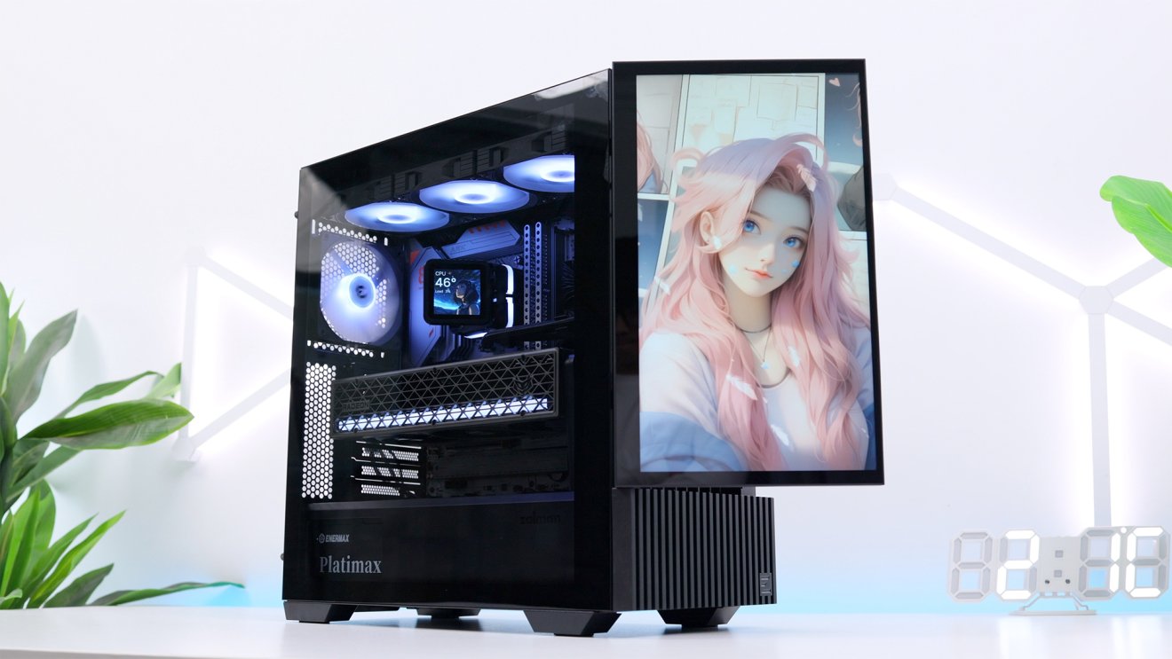 前面板的格栅也可以替换成一块15.6英寸的高清大屏,1920*1080分辨率、60Hz刷新率,和早些年“高分屏”笔记本的屏幕一模一样,比一般机箱自带的屏幕又大又清晰。当然,装上屏幕以后就会遮挡机箱前面板的出风格栅,有更高散热需求的朋友也可以把这块屏幕摘下来,搭配附送的支架底座单独使用,相当于另外搭配了一块15.6英寸的副屏,横向、竖向都能用。