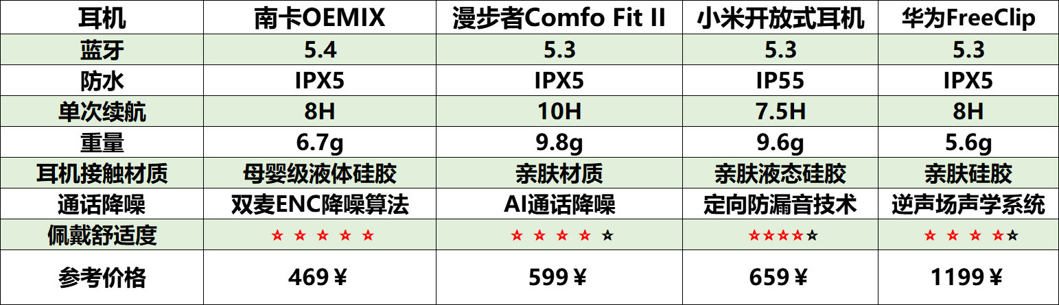 今天,我就把挑选开放式耳机时整理的资料干货分享给大家,顺便对比一下市面上比较火的几款产品。不想看长文的朋友,可以直接看下面这个表格: