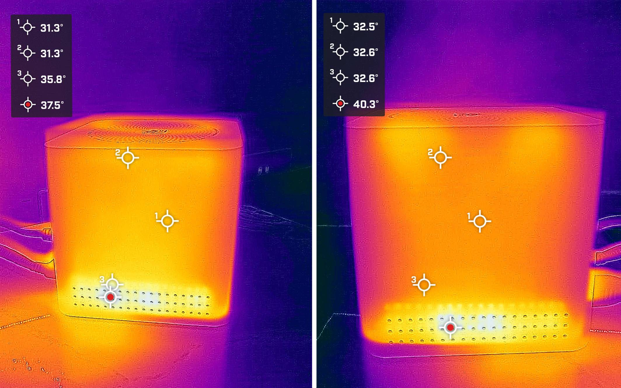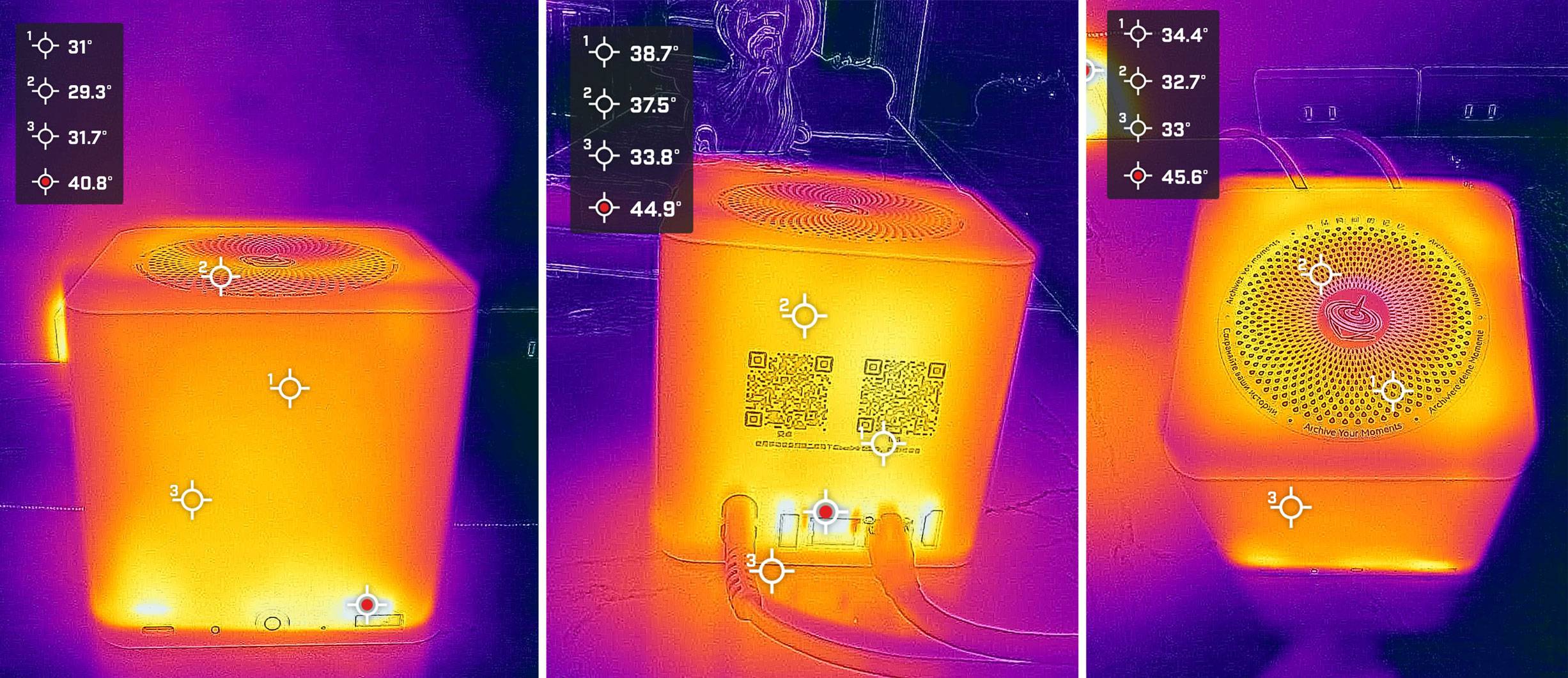 通过红外测温观察,设备顶部散热片区域为发热最明显位置,最高温度达到45.6℃;正面接口区温度最高为40.8℃;侧面进风口温度则维持在31℃至40℃之间,整体热量分布均衡,说明散热系统设计科学合理。