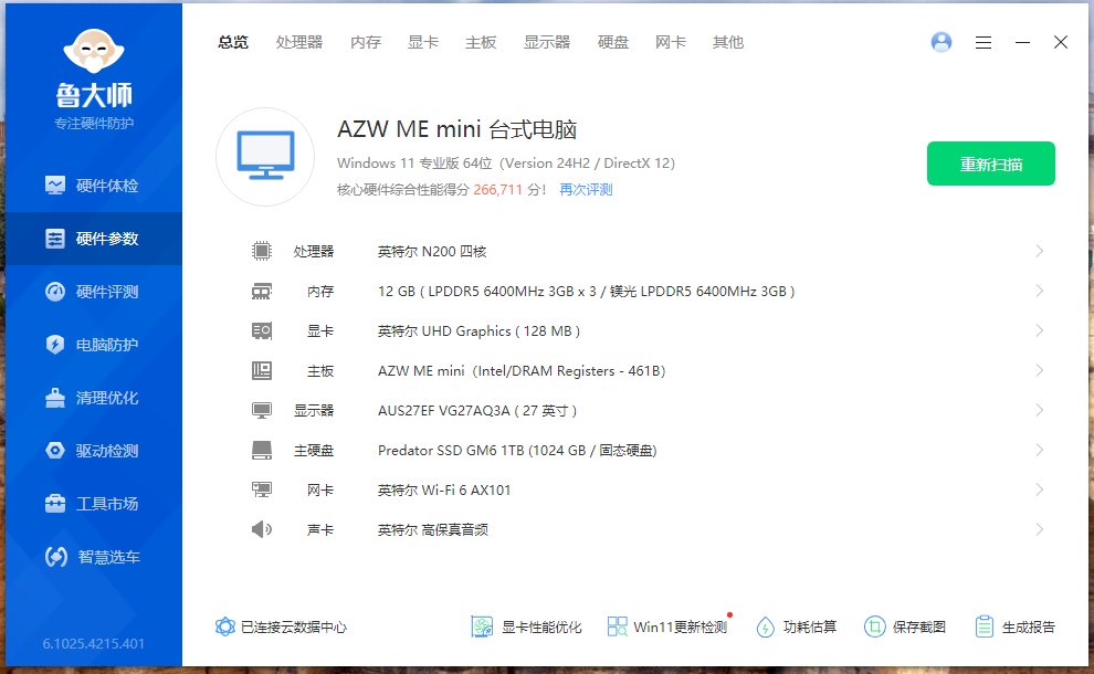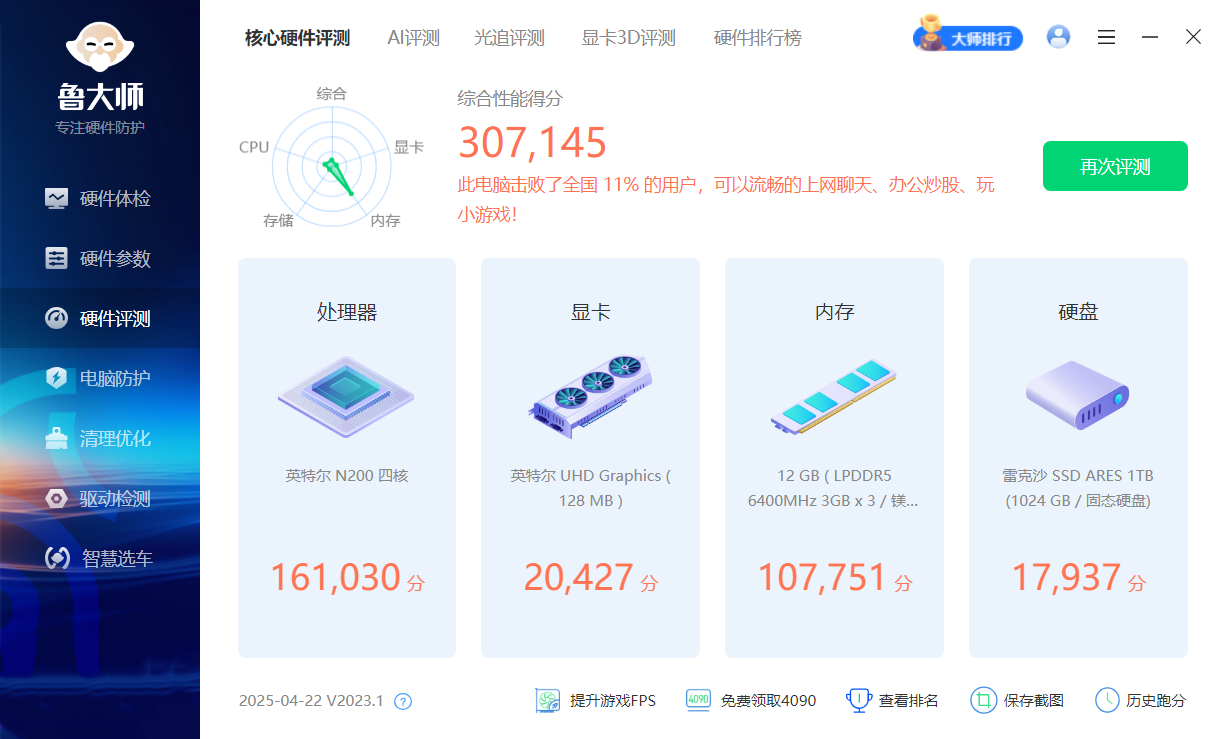 在鲁大师的性能测试中,零刻 ME mini 综合得分达到307145分,表现相当不错。具体来看,CPU部分得分为161030,显卡得分20427,内存为107751,硬盘得分为17937。整体数据反映出这台小巧主机在日常使用中具有良好的响应速度和多任务处理能力,无论是轻办公、网页浏览、文档编辑还是视频播放,都能轻松应对,作为一台低功耗高效率的办公终端完全没有问题。