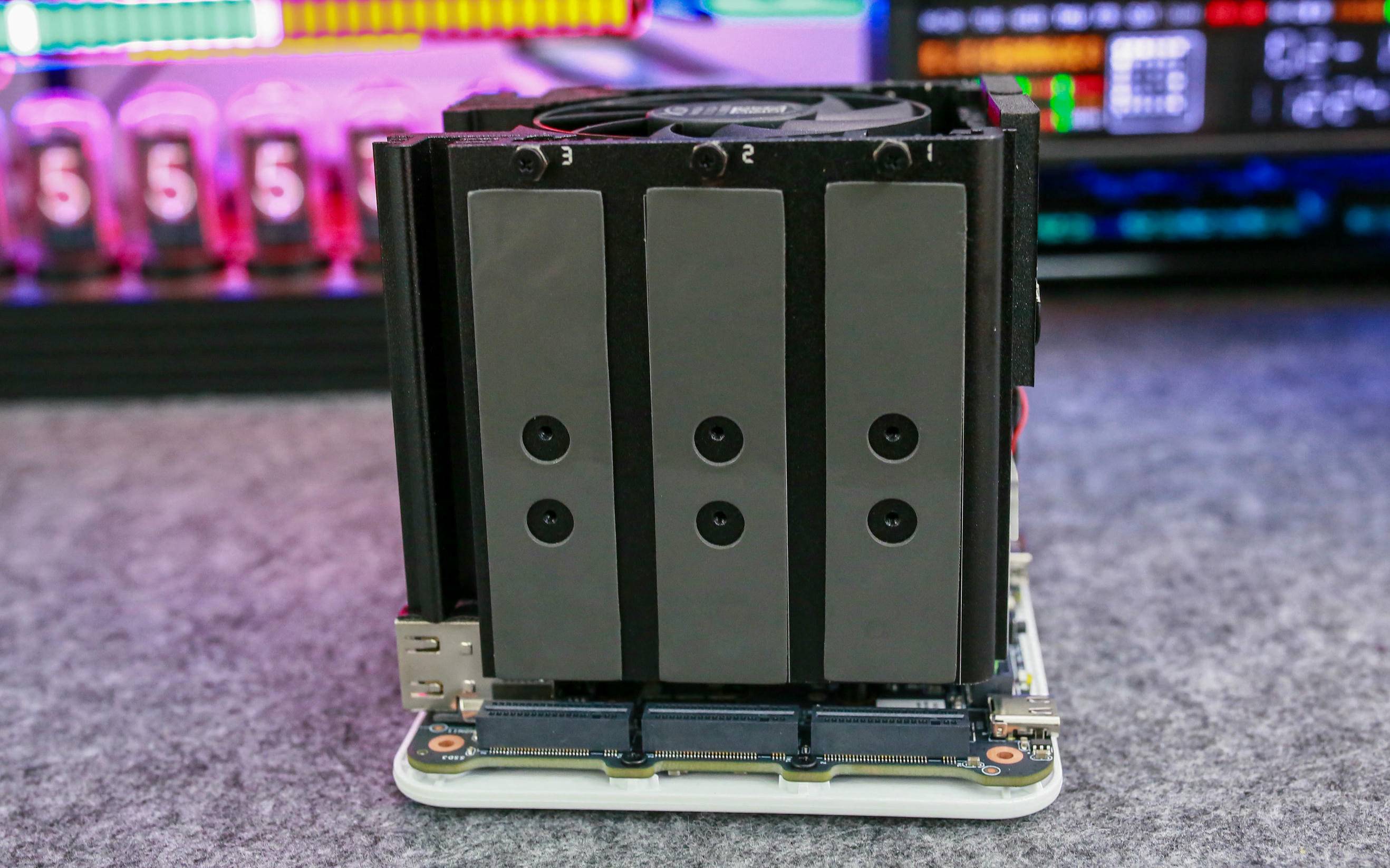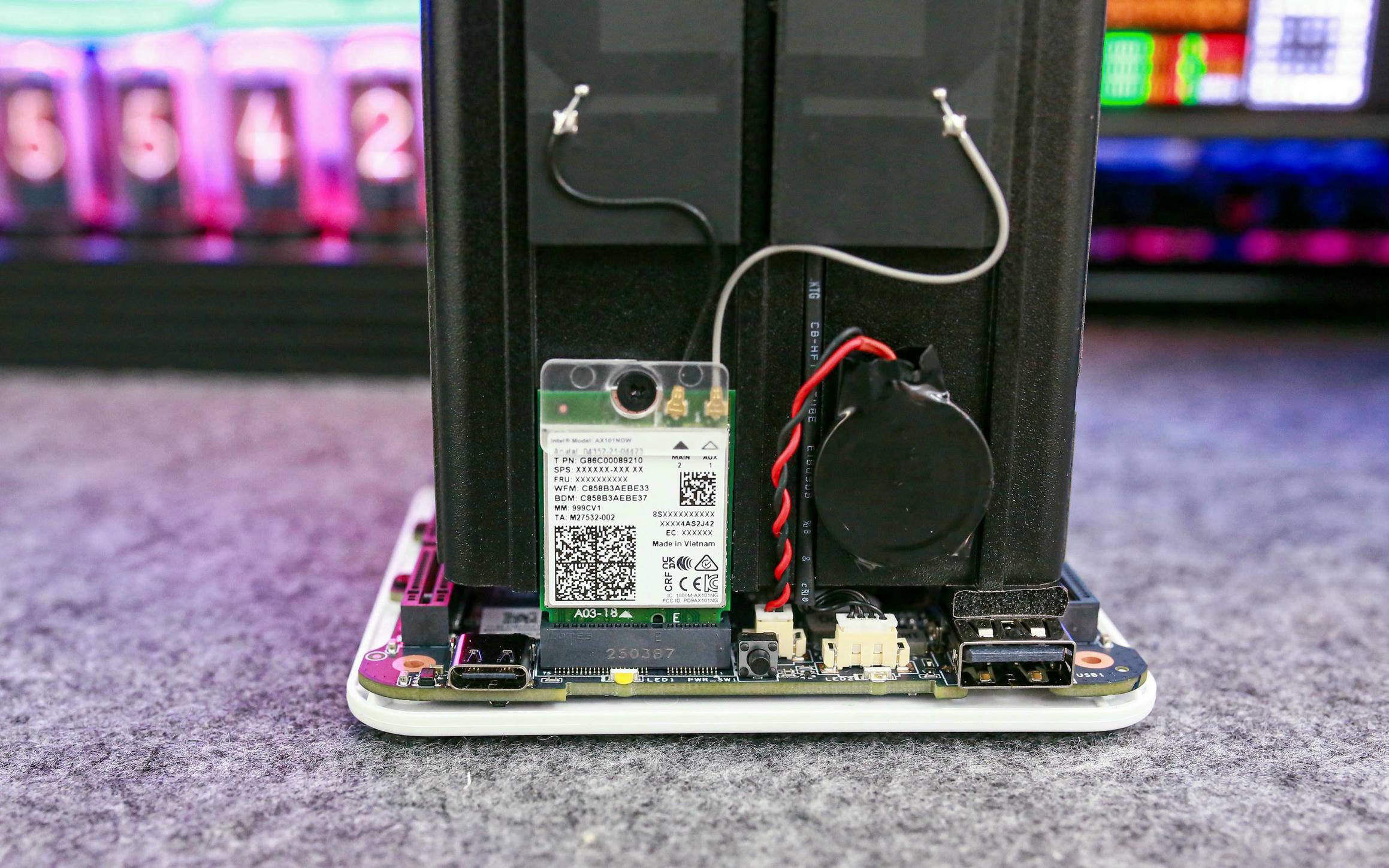 打开 ME mini 外壳后可以看到,它的内部结构与传统迷你主机大不相同,采用了底部主板、金属散热框架与顶部风扇相结合的垂直风道布局。这种设计不仅大幅提升了空间利用率,也有助于实现更高效的散热。包括内置电源模块、6个 M.2 盘位、无线网卡和天线等关键元件,均被巧妙地安装在金属散热框架上,排布紧凑而有序。正面一侧还整合了 Intel AX101 无线网卡、天线模块以及 CMOS 电池,方便维护。