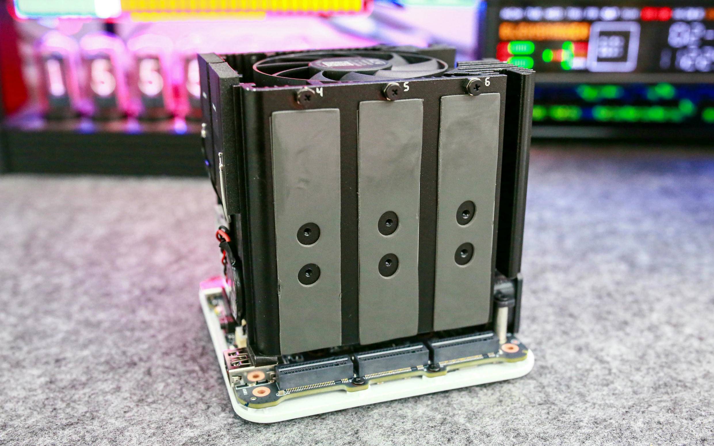 ME mini 提供了6个M.2盘位, 最大可支持24TB的存储容量。其中第4号位支持PCIe Gen3.0 x2和SATA双协议,其余5个为PCIe Gen3.0 x1通道。在选择 SSD 时,速度无需过高,确保读写速度不低于 2500MB/s,选择读写速度在 3000-5000MB/s 的SSD硬盘就已经非常合适了。