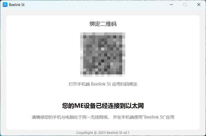 在 Windows 系统下,零刻自主研发了 Beelink ST 存储管理应用,提供便捷的远程备份与共享功能。该应用支持 Android 8.0+ 和 iOS 12+ 设备使用,需搭配 Windows 端的 Beelink ST 软件共同运行。首次启用时,用户需在局域网内通过扫码绑定 ME mini,并授予相应权限后方可使用。