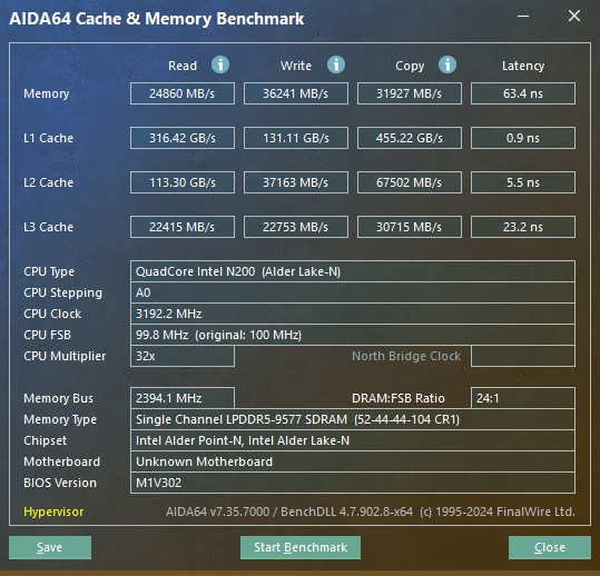 在测试中,内存的读取速度达到24860MB/s,写入速度为36241MB/s,复制速度为31927MB/s,延迟为63.4ns,延迟非常低,从读写速度上来看,零刻 MEmini能够高效处理大量数据传输任务,提供流畅的操作体验,适合运行各种高负载应用和任务。