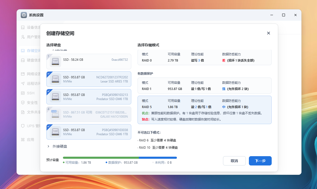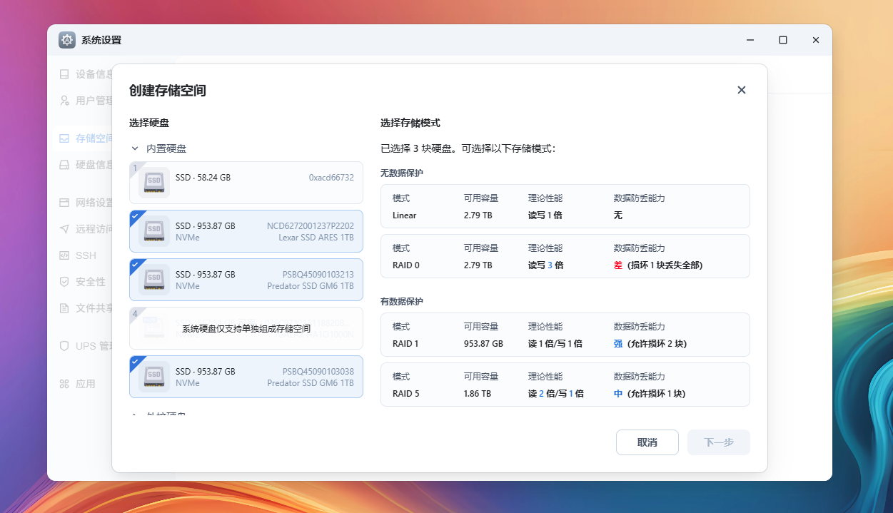 接下来可以根据个人使用需求创建存储空间,比如单盘直通、RAID阵列,或是划分多个独立分区,灵活应对不同使用场景。初始化完成后,系统即进入稳定运行状态,飞牛OS的全部功能也随之解锁,至此整个安装部署流程圆满完成。