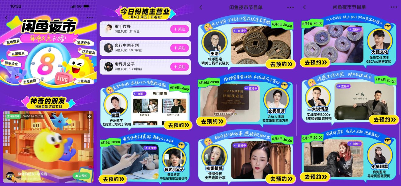 在“闲鱼夜市”你可以掏出家中压箱底的老宝贝让文玩鉴定师品鉴一番,或在宠物直播间为自己毛孩子相亲交友“包办爱情“,也可在这里与情感疗愈师连麦化解一周的班味,与育儿专家交流养娃经验,向职业律师寻求法律援助,还可以在线跟着音乐学院老师学习唱歌技巧,或跟着“方言大师”说一口地道的上海话、四川话、粤语、长沙话等等,陶冶情操、提升技能的同时拓宽社交圈子。