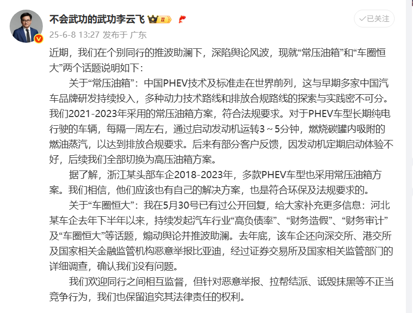 再说说最近某品牌大佬公开提起常压油箱的问题,这都过去几年了,而且政府部门已经介入,比亚迪李云飞也正式回应,关于“常压油箱”:中国PHEV技术及标准走在世界前列,这与早期多家中国汽车品牌研发持续投入,多种动力技术路线和排放合规路线的探索与实践密不可分。我们2021-2023年采用的常压油箱方案,符合法规要求。国家都没说什么,你公开质疑,能不能不要老是盯着自己人,奇瑞就深有体会,还感谢比亚迪分摊活力,真的太难了!团结起来一起发展,一致对外不好么。