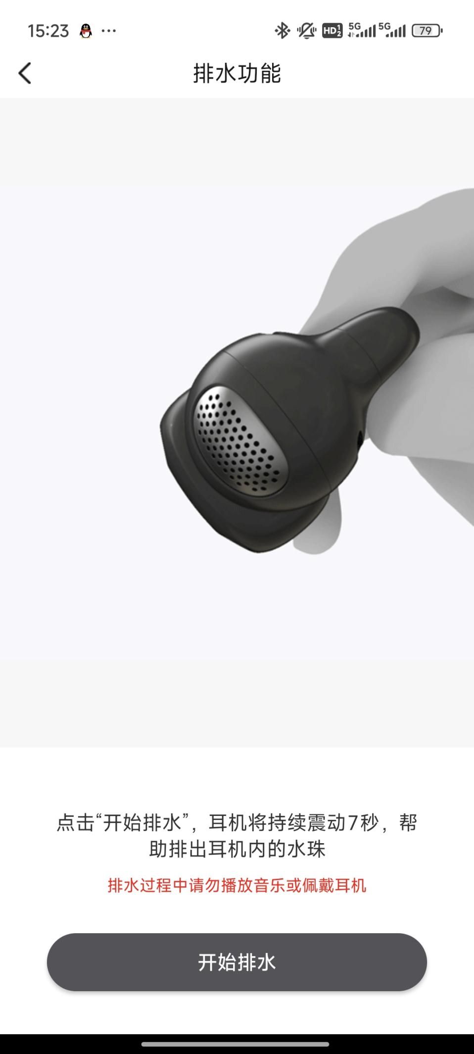 这款耳机支持IP56级的防尘防水,还搭配了排水功能,通过震动帮助排出耳机内的水珠,这可以说是很实用的配置了,很多智能手表也有这个配置。