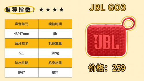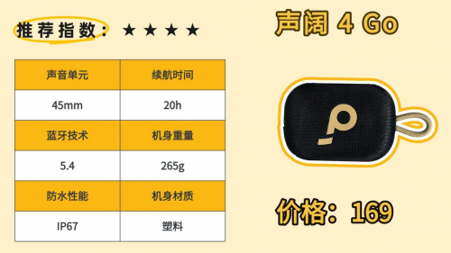 综合表现:这款音箱体积小巧,可以轻松放入背包中携带,还自带编制挂绳,可以轻松拎出门!此外,它还具备IP67级别的防水功能,能够完全浸入水中而不受损,非常适合户外活动使用。