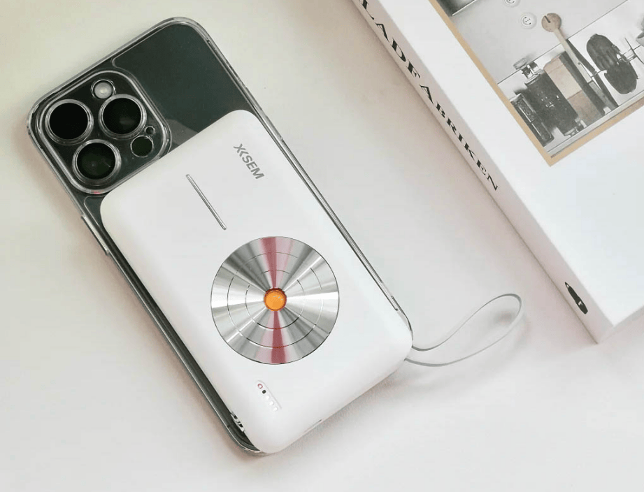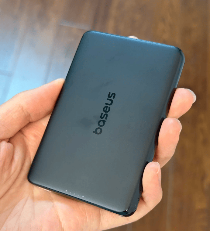 这款充电宝整体设计简洁大方,机身中央仅印有一个logo,避免了繁杂装饰。它支持磁吸充电,但配备的13N磁芯吸力较弱,使用时容易出现断连现象,有待改进。