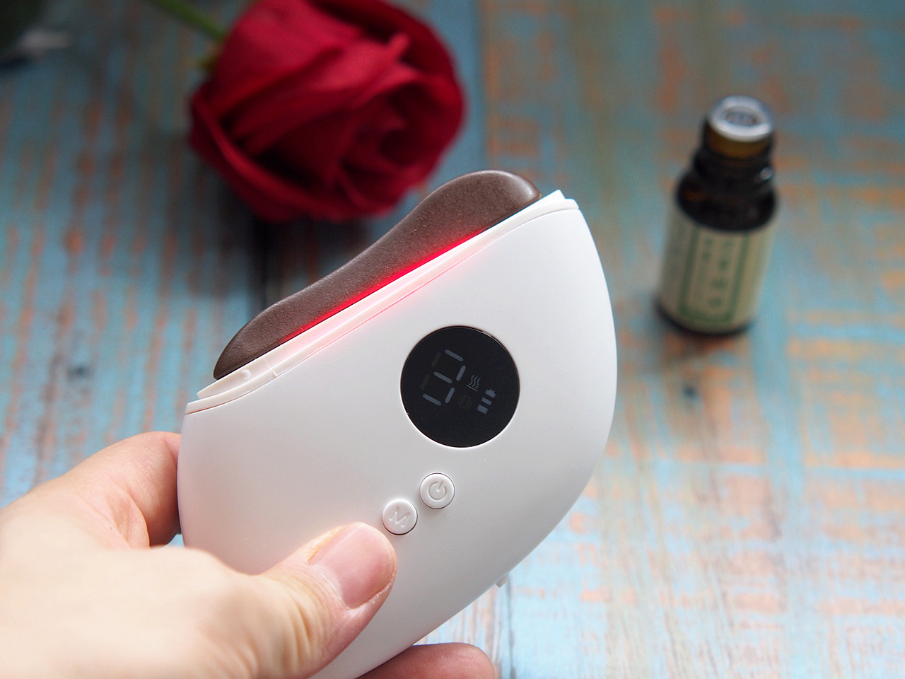 奢茉砭石刮痧板有三档加热温度,温度适合不会烫伤皮肤,而且还有一档震动效果,实际使用起来非常方便很顺手,加入精油后效果更加明显。
