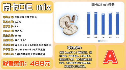 性能优势:南卡 OE Mix 采用蓝牙 5.3,连接稳定,抗干扰能力强,在户外、通勤等场景下都能保持流畅音频体验。支持 ENC 通话降噪,双麦拾音,在嘈杂环境中依然可以保证清晰通话。续航表现优秀,单次可达 10 小时,搭配充电盒最长 40 小时,满足长时间使用需求。