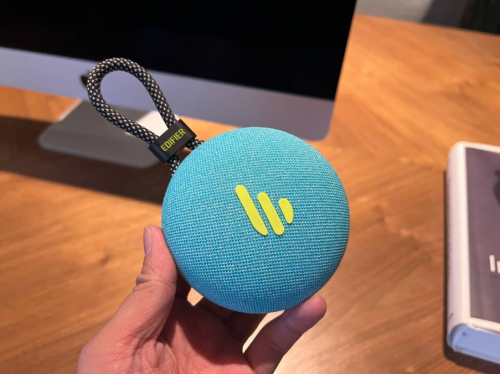 这款蓝牙音箱体积紧凑小巧,重量只有185g,单只手掌刚好可以完整的握住它,扁圆形的设计也更容易手持,为了更加方便户外携带,还设计了一个非常有质感的编织挂绳,整体的便携性很不错。