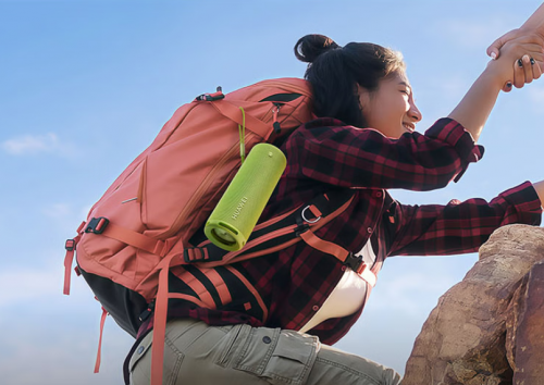 这款蓝牙音箱采用圆柱形机身设计,机身重量仅274克,搭配防滑条纹硅胶外壳与可拆卸双悬挂手带,可垂直摆放或悬挂于背包、单车上,便携不错。