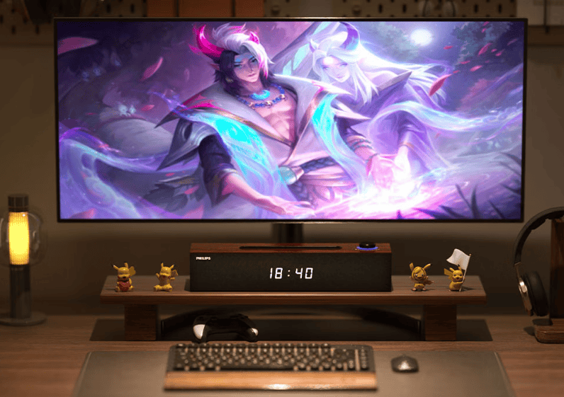 这款蓝牙音响最大的亮点就是内置有数字时钟显示屏,方便随时查看时间。顶部还配备了手机支架,方便我在观影或游戏时放置手机。同时双喇叭设计不仅提升了立体声效果,还为游戏和工作带来了沉浸式的体验。旋钮式音量控制则支持360度切换,便于我们随时调节音量。而且木质箱体简约又大方,摆在桌面上很有格调。此外,它支持有线和无线两种连接方式,既可以直接插在电脑上使用,又可以通过蓝牙连接,不过它自身没有配备内置电池,必须持续连接电源才能使用,所以更适合固定放置在家中使用。