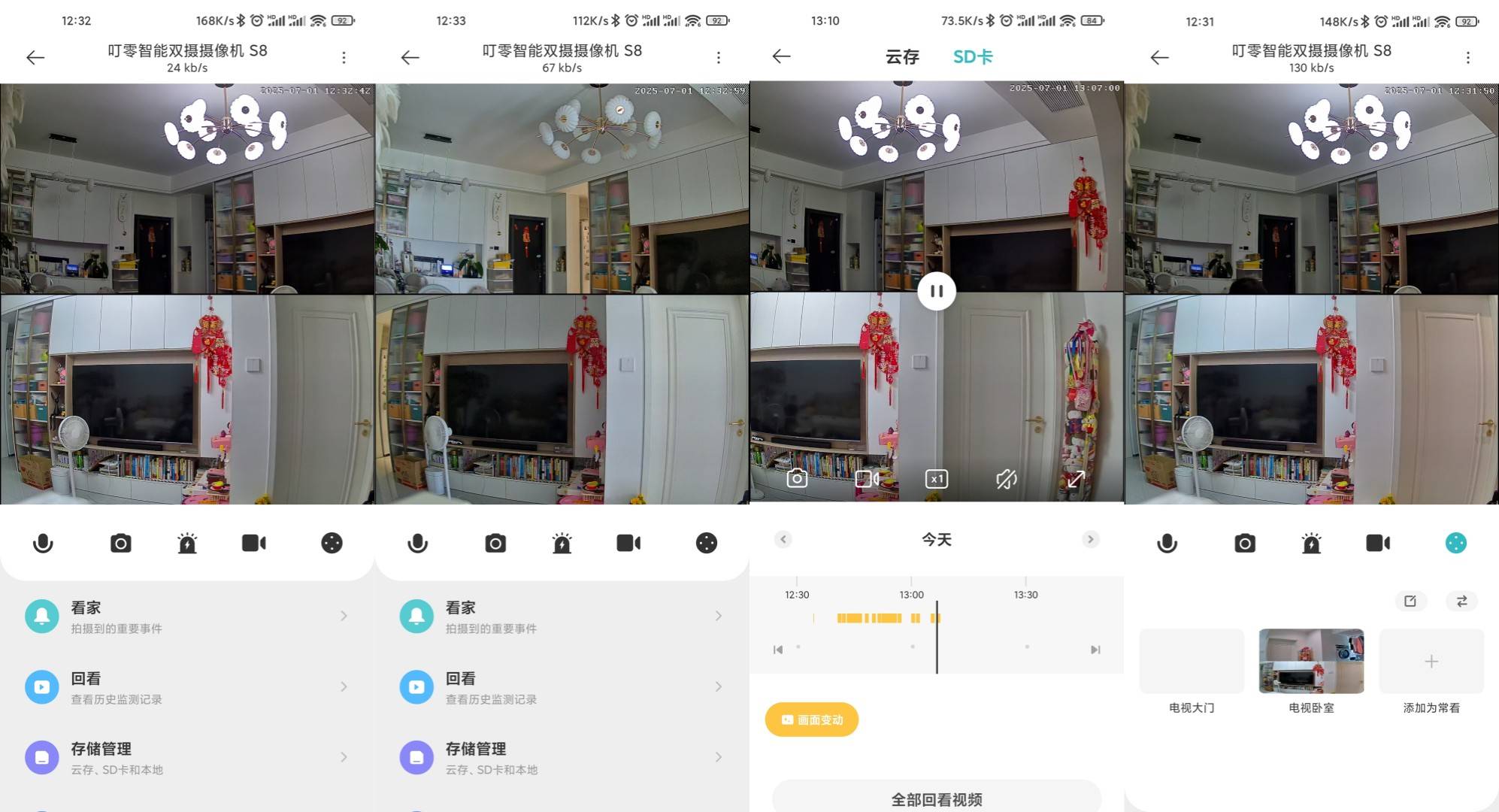 智能家居产品接入米家的好处就是不用单独APP,我家所有的摄像机全是米家一个APP就能查看控制,方便还省手机内存。由于双摄的存在,查看监控画面就变成了上下双镜头画面,两个画面可同时预览和回放,颇有点坐在监控室中运筹帷幄的感觉。注意看一下截图中的前两张监控画面,室内不开灯弱光环境下的智能全彩高清夜视功能让弱光环境下的监控画面和开灯状态下几无差异。