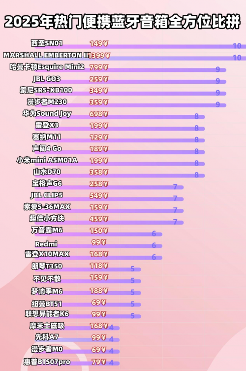 如今,蓝牙音箱在生活中愈发普及,给我们的日常娱乐带来了诸多便利。但一走进市场,你会发现蓝牙音箱品牌多得让人眼花缭乱,很多人都纠结不已:到底蓝牙音箱什么品牌质量好音质好?其实,像在音频领域深耕多年的JBL,打造出的音箱音质表现一直很亮眼;索尼在声音还原、音效调教上有深厚功底;还有专注声学技术的 Bose,其音箱能带来优质的聆听体验。当然,国产品牌这几年进步飞快,比如西圣和漫步者在中低端市场推出不少性价比高的产品。接下来,就为大家精选出 2025年 10大音质最好的小蓝牙音箱。
