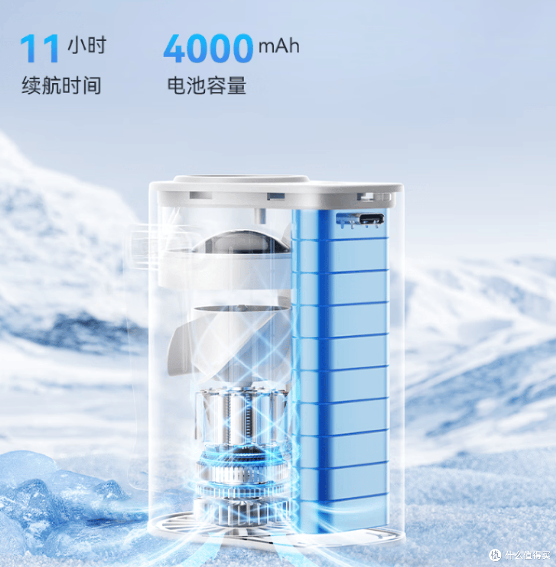 ▲所以这个西圣挂脖风扇也是在小机身上面塞下了大电池,4000mah的大容量电池,续航时间大概是11小时左右。嘎嘎猛的续航。